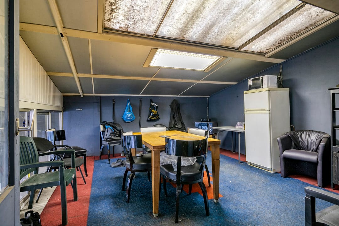 - De werkplaats is voorzien van metselwerk gevels, een betonvloer en stalen dakplaten.