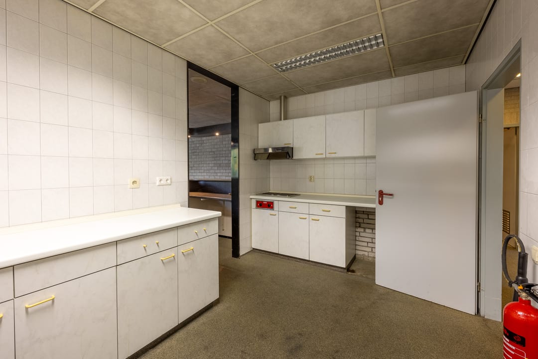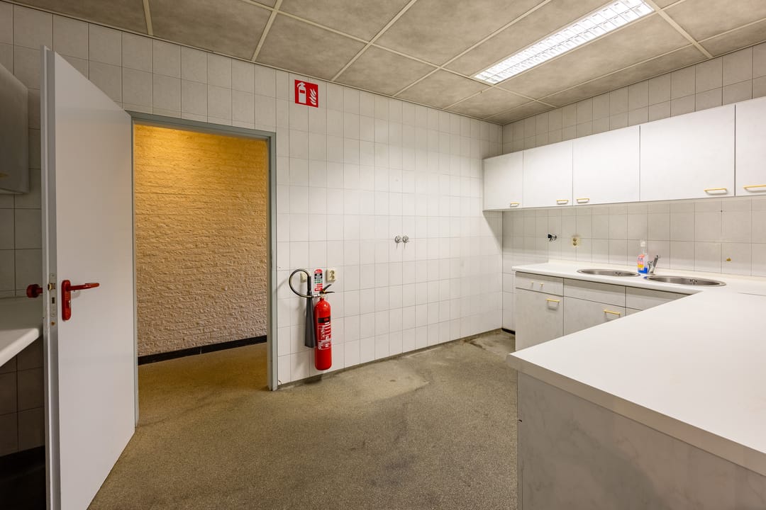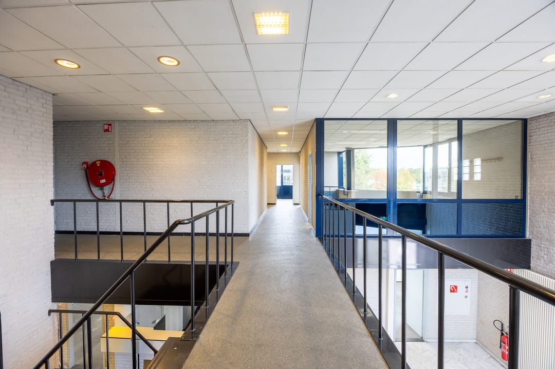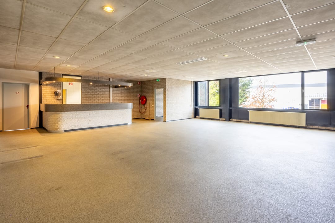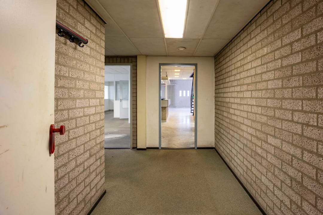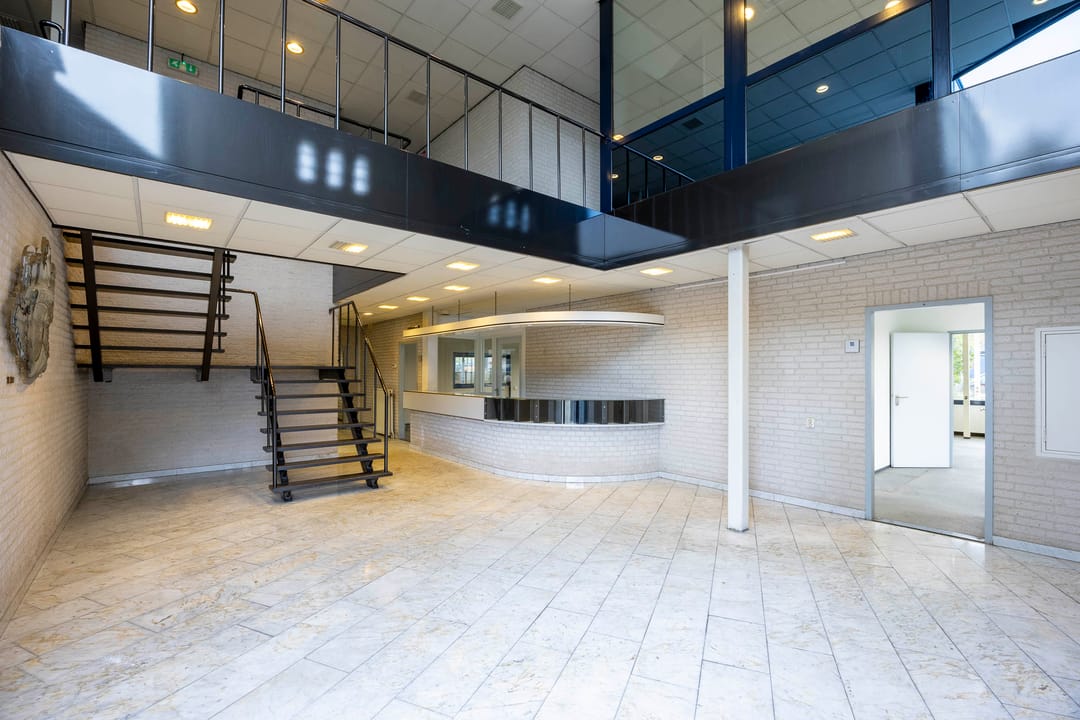 De glazen entree is uitnodigend en zorgt met het hoge plafond, de vide en de marmeren vloertegels voor een representatieve en luxe uitstraling bij binnenkomst. In de hal vind je een baliefunctie, sanitaire voorzieningen (gescheiden), houten bordestrap naar boven en toegang tot een kantoor. Alles staat met elkaar in verbinding, vanuit hier loop je ook zo de bedrijfshal in, waardoor de indeling prettig open aanvoelt. Op de verdieping vind je diverse spreek-/kantoorruimtes , data/computerruimte met pater noster kasten en een royale kantine met keuken.