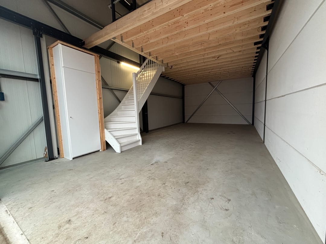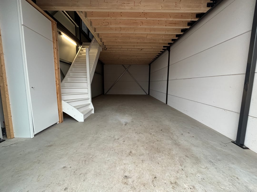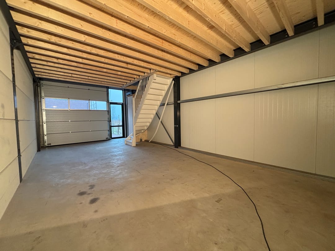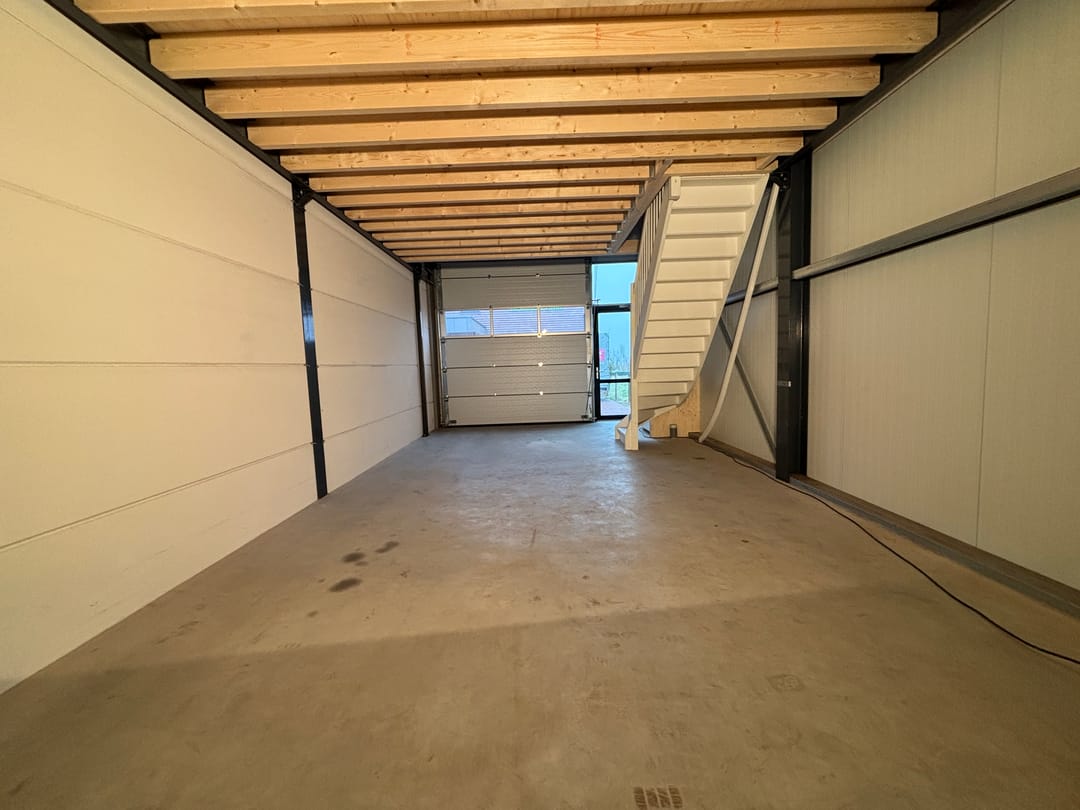 Entree middels een loopdeur of de elektrisch bedienbare overheaddeur. Bij binnenkomst treft u de meterkast en voorbereiding t.b.v. het toilet. Middels de houten trap wordt de verdiepingsvloer bereikt.