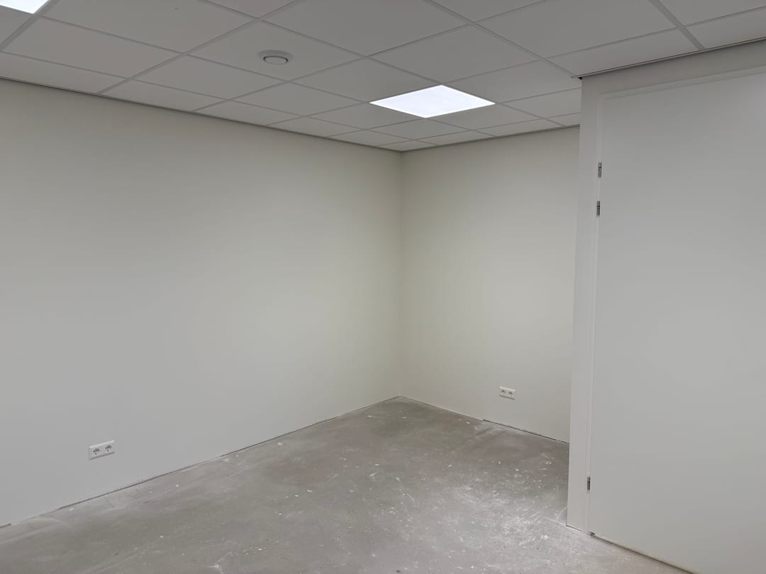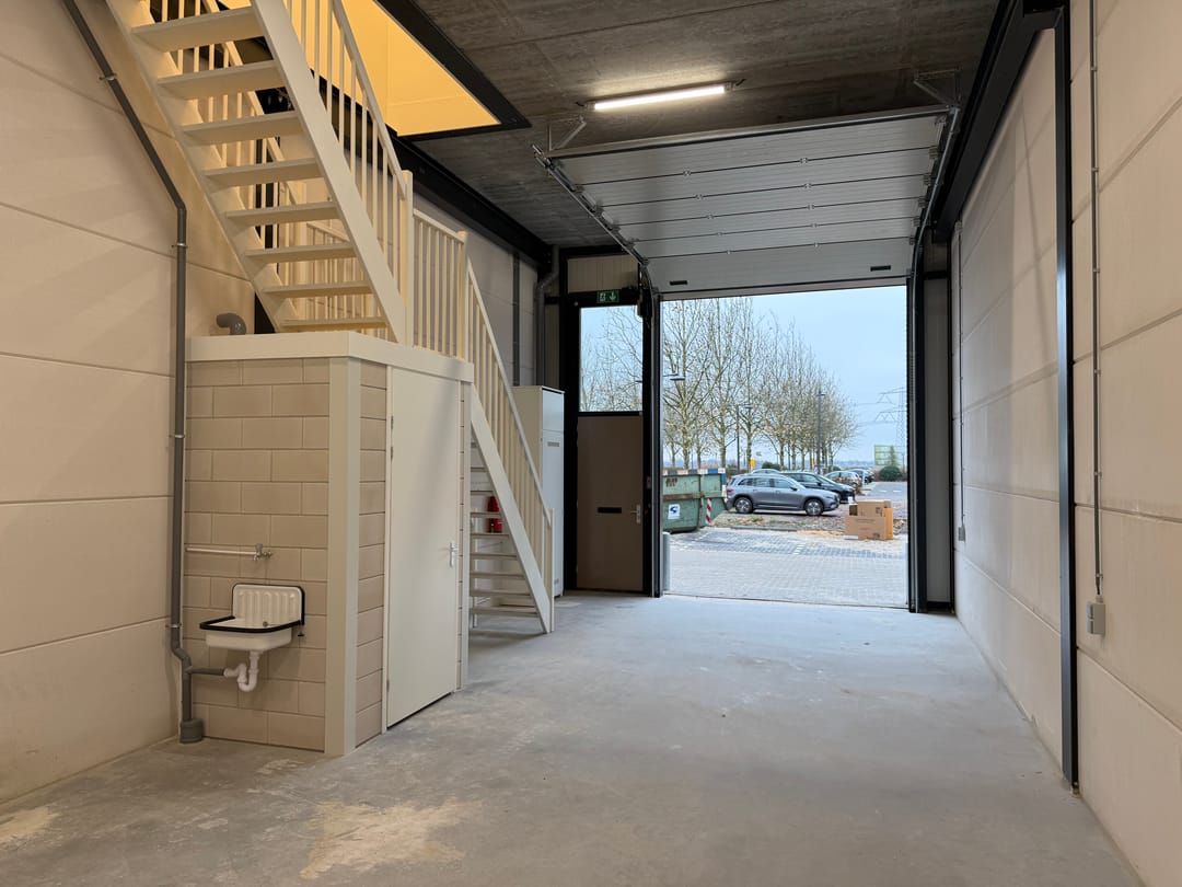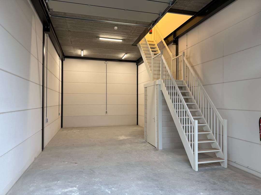 - Overheaddeuren, betonvloer, toilet, pantry, airconditioning en inbouwarmaturen