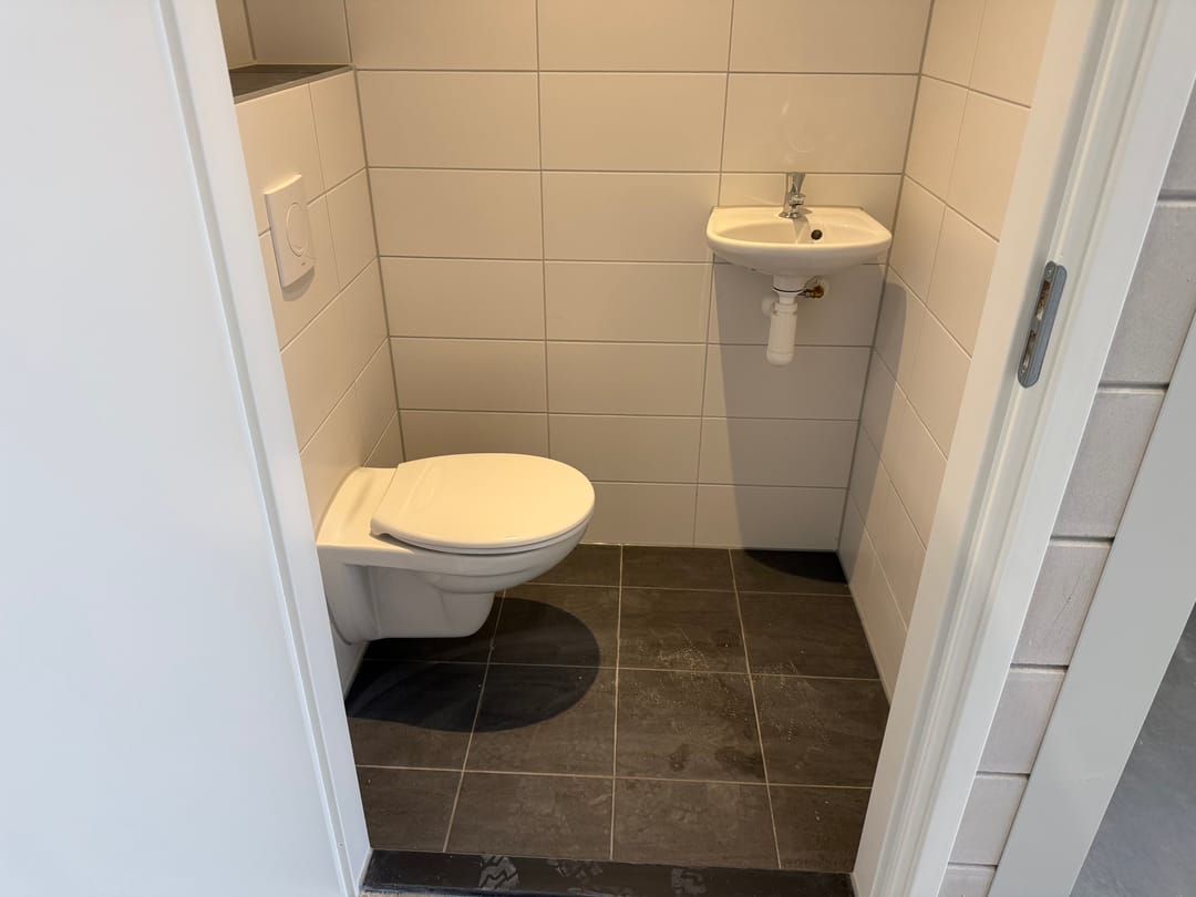 - toiletruimte met vloertegels, wandtegels, wandcloset, fonteintje en lichtpunt met sensor;