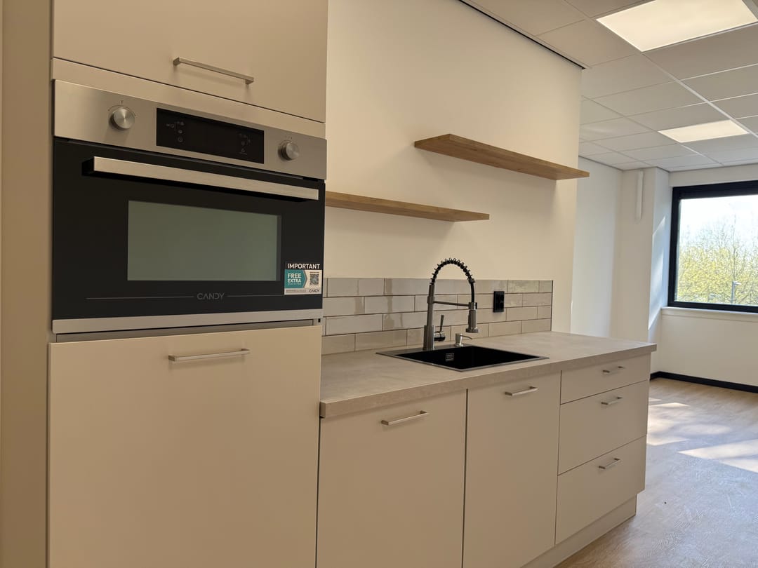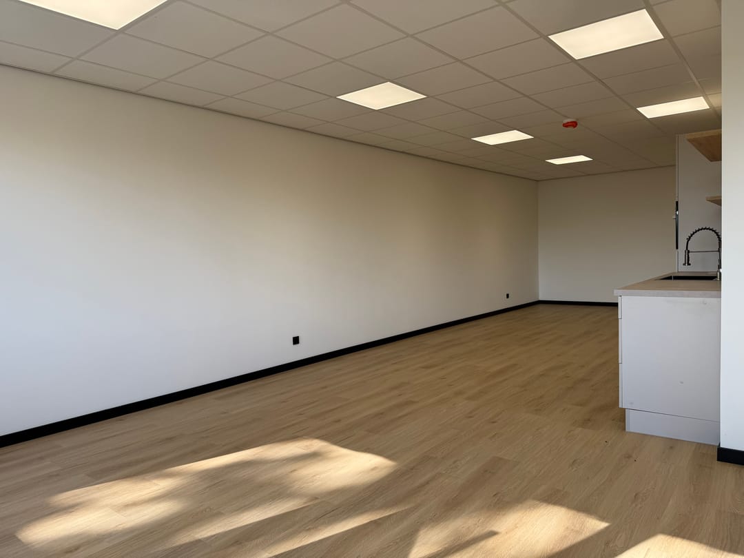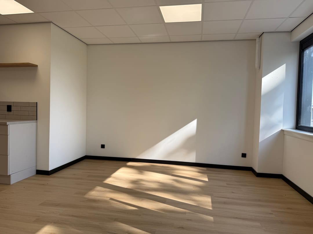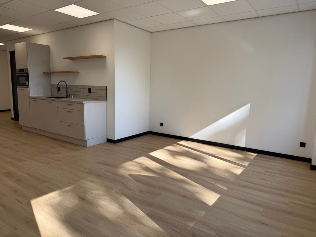 Van casco naar turn-key, wat houdt dat in? Dat houdt in dat álles voor je is afgewerkt en geregeld. Van een dichtgezette/afgesloten trap, tot aan een gelegde vloer, pantry (met combi oven, koelkast, spoelbak en vaatwasser), wandafwerking, gave zwarte plinten, plafondverlichting en een toilet. Je zet je bureau's neer, vult de koelkast en kunt meteen van start!