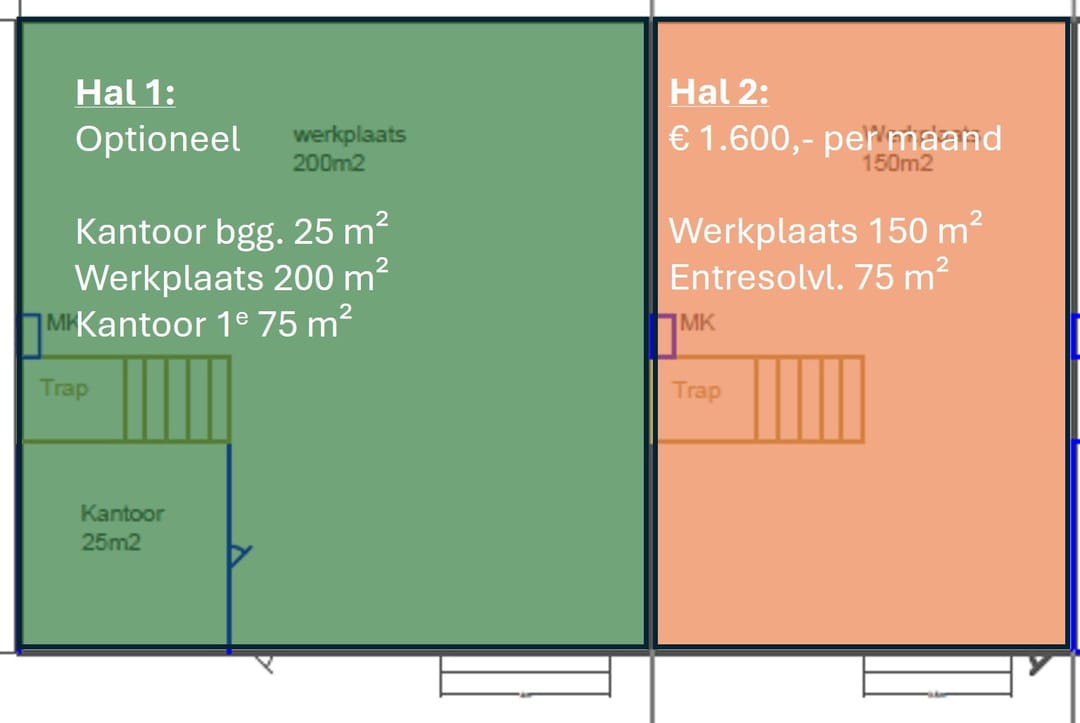 - Overheaddeuren, krachtstroom, betonvloer, toilet en pantry