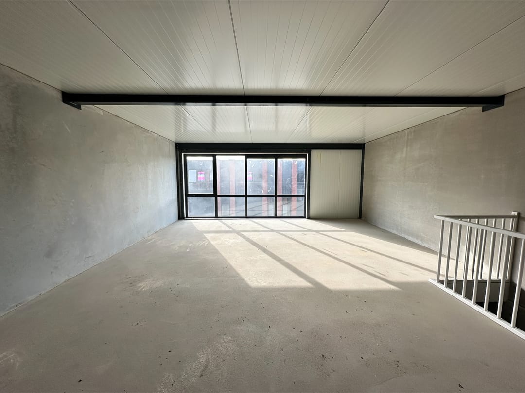 Het betreft een royale bedrijfsruimte op de begane grond van maar liefst 113 m². Deze ruimte heeft voor de helft een vrije hoogte van maar liefst 7,0 m! De andere helft heeft een hoogte van circa 3,50 m. De betonnen verdiepingsvloer van circa 56 m² is bereikbaar via een vaste trap.
