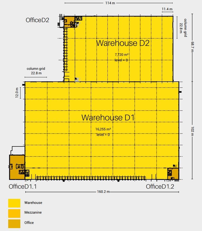 Circa 8.691 m² is beschikbaar voor verhuur in warehouse D2 en is als volgt verdeeld: