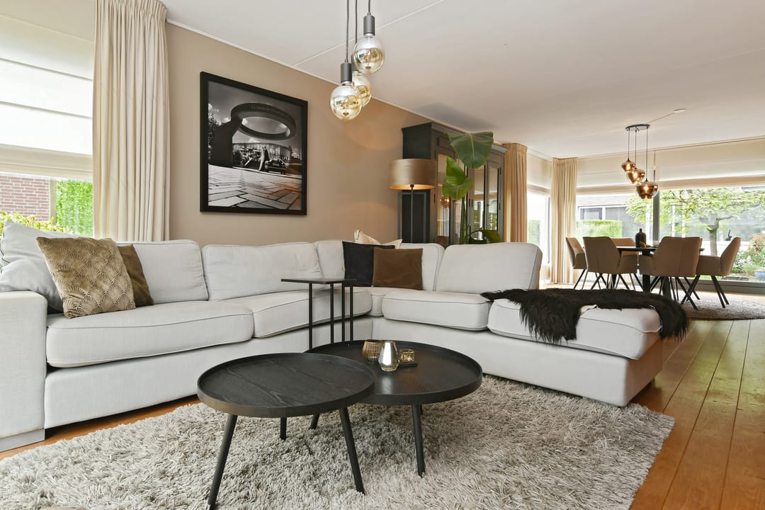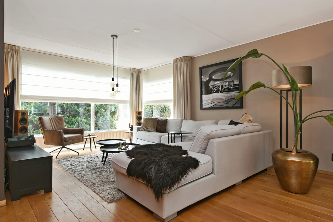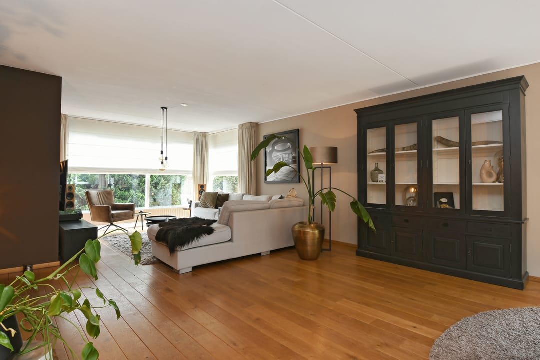 Woonkamer van circa 47m2 met een schuifpui en toegang tot de keuken. De kamer is afgewerkt met een houten vloer.