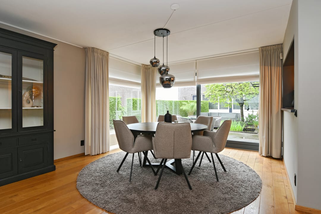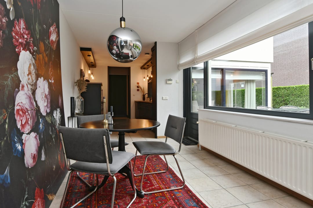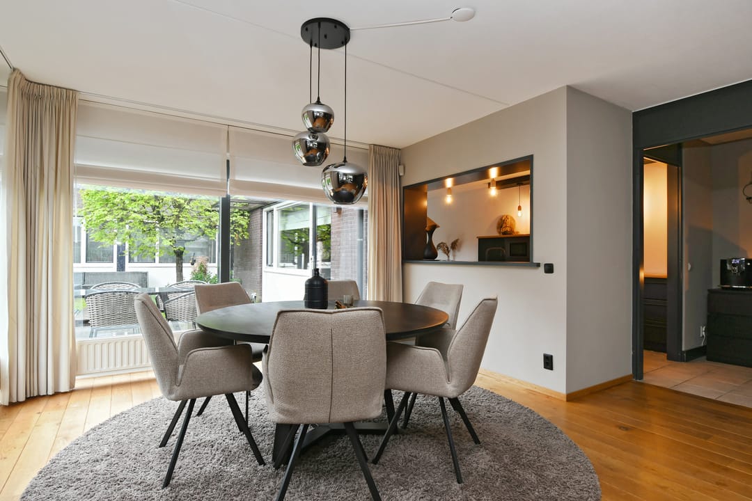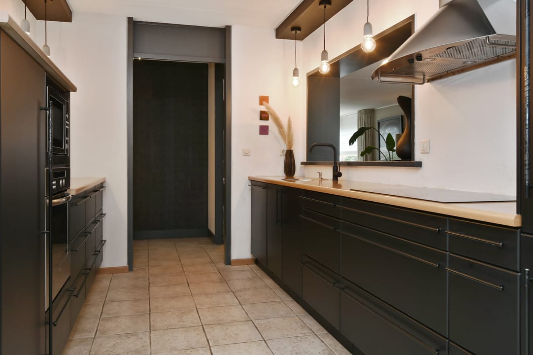 Half open woonkeuken met een keukenmeubel aan 2 zijden, deur naar de tuin en toegang tot de bijkeuken. De keuken is uitgerust met een inductiekookplaat, oven, magnetron, afzuigkap, vaatwasser en koel-/vriescombinatie. De keuken is afgewerkt met een tegelvloer die doorloopt in de bijkeuken en hal.