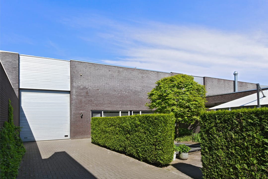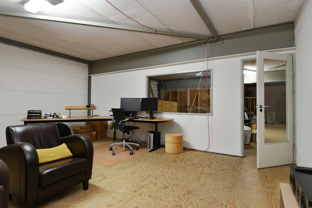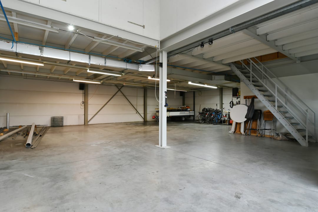 Open bedrijfsruimte met een elektrische overheaddeur (3,4m x 4,0m), meterkast, trapopgang, bergruimte en kantine. Kantine met een keukenmeubel en toegang tot een sanitaire ruimte. Geheel betegelde sanitaire ruimte met een wastafel, urinoir en apart toilet met inbouwcloset.