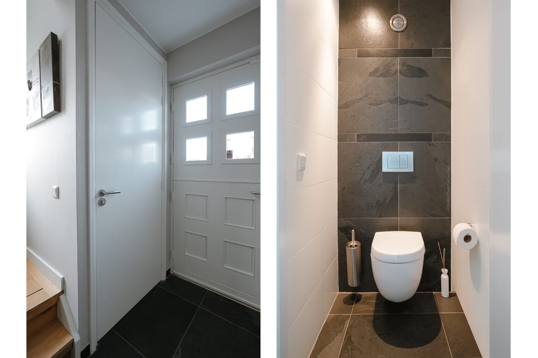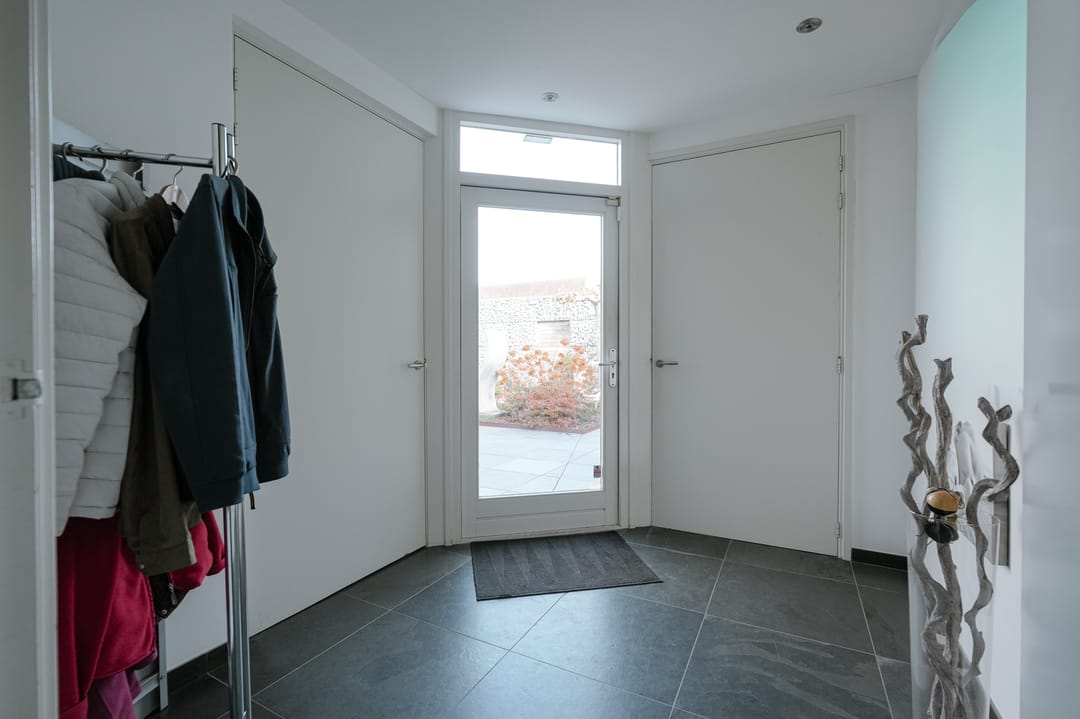 Hal/entree: voorzien van tegelvloer, toilet en fraaie houten trap naar de eerste verdieping.