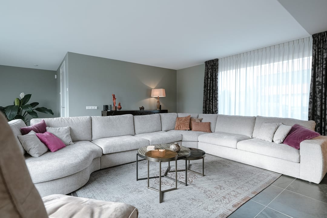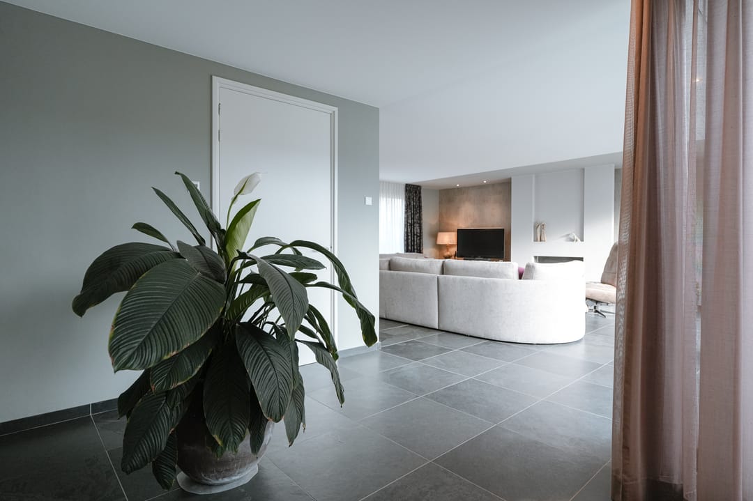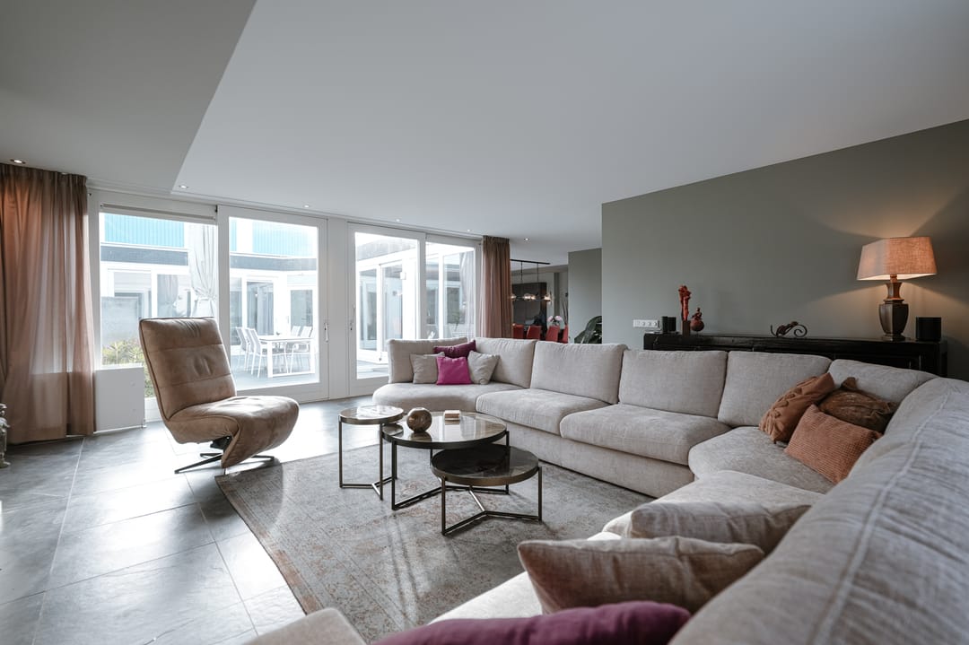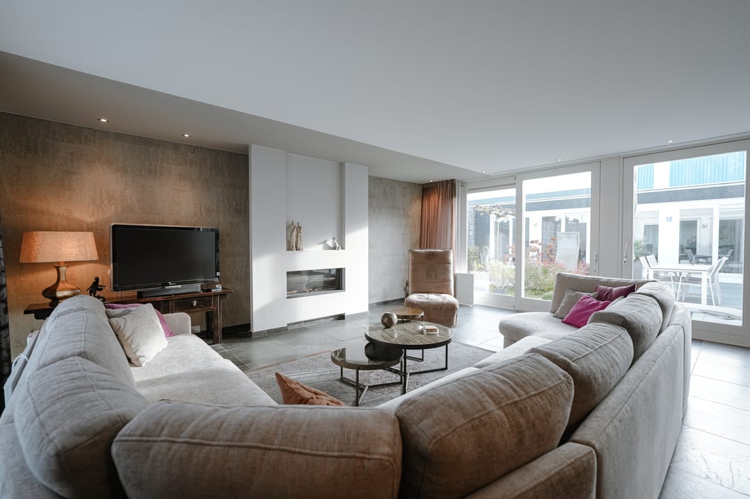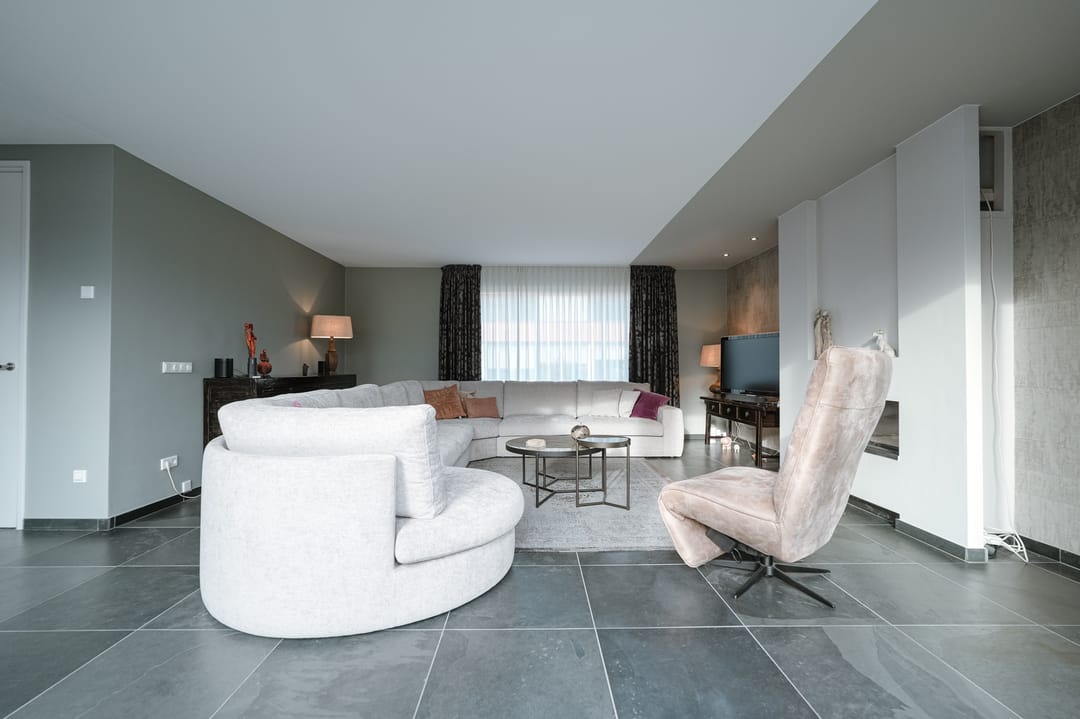 Woonkamer: zeer ruime woonkamer met veel daglicht toetreding, voorzien van tegelvloer en een gashaard.