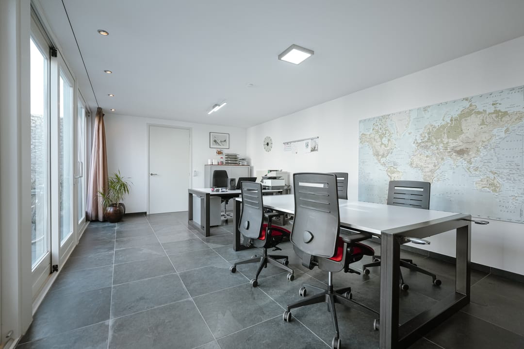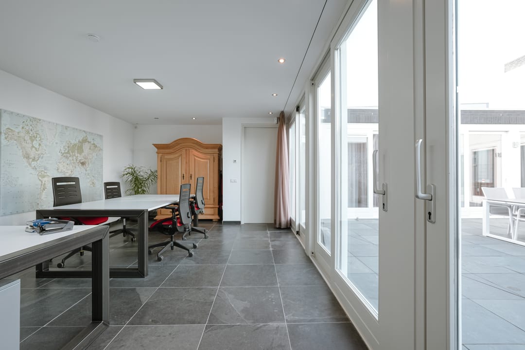 Kantoor: ruim kantoor met tegelvloer en uitzicht op de tuin.