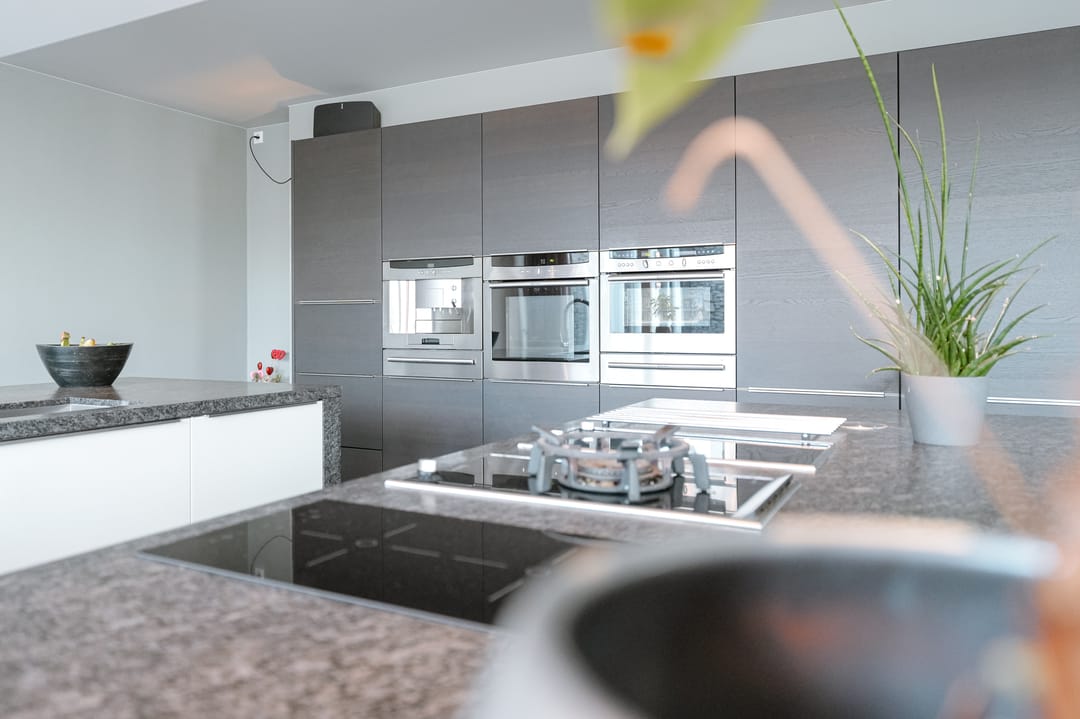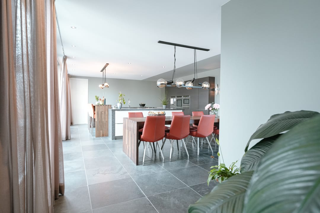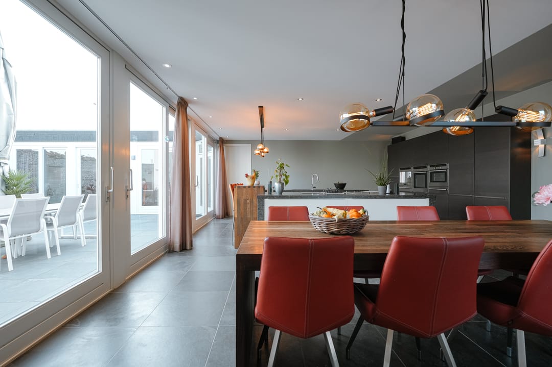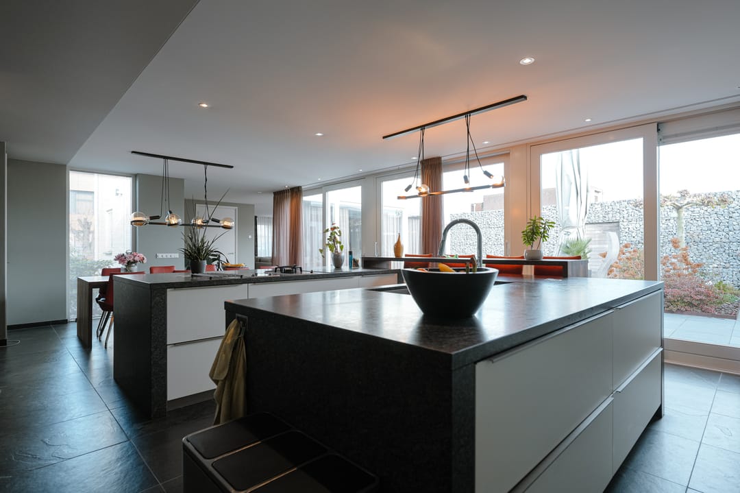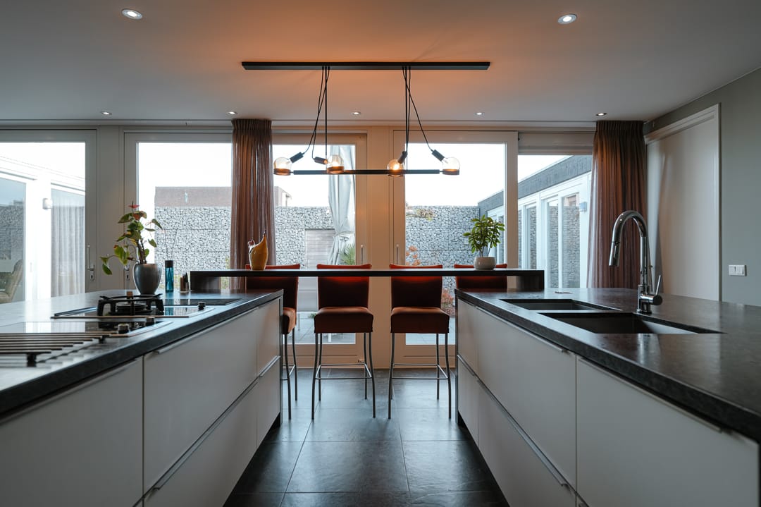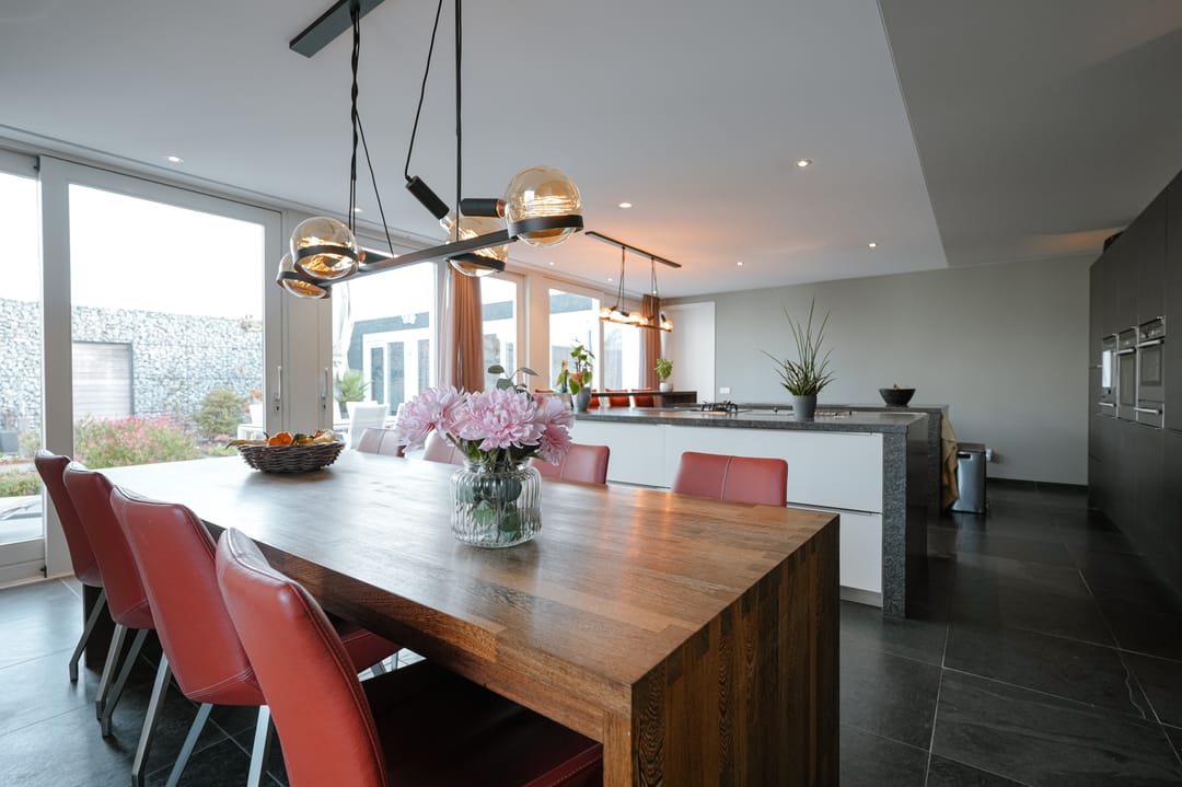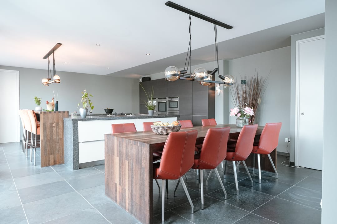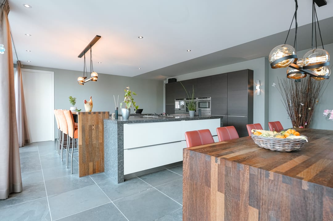 Woonkeuken: de luxe woonkeuken is van alle gemakken voorzien. Twee ovens waarvan één stoomoven, inbouw koffiezetapparaat, vaatwasser op werkhoogte, een kookeiland voorzien van inductie én gas, een spoeleiland met twee gootstenen en een bar om aan te zitten. De woonkeuken is tevens voorzien van een tegelvloer en veel daglicht toetreding.