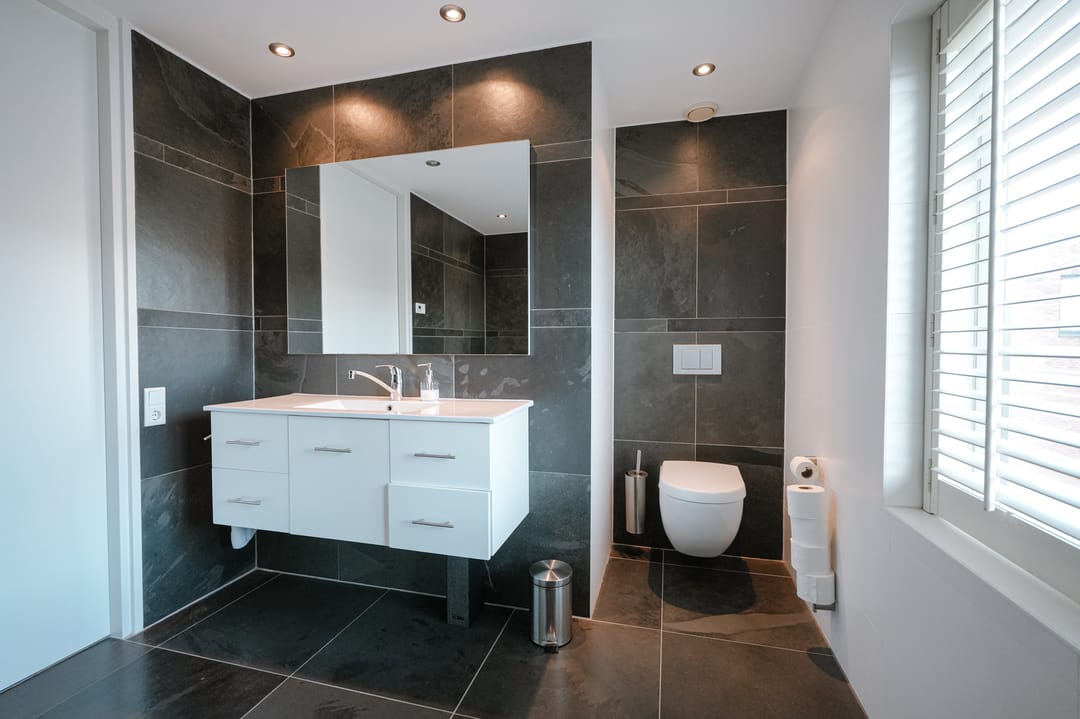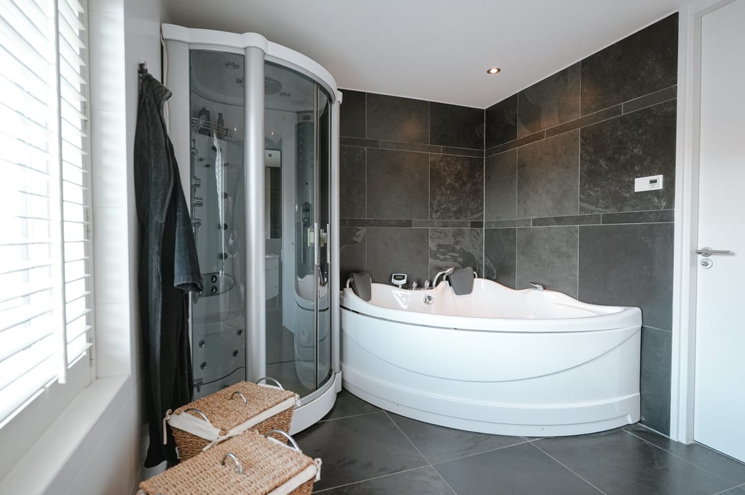 Badkamer: voorzien van tweepersoons bubbelbad, douche, toilet, wastafel, tegelvloer en daglichttoetreding.