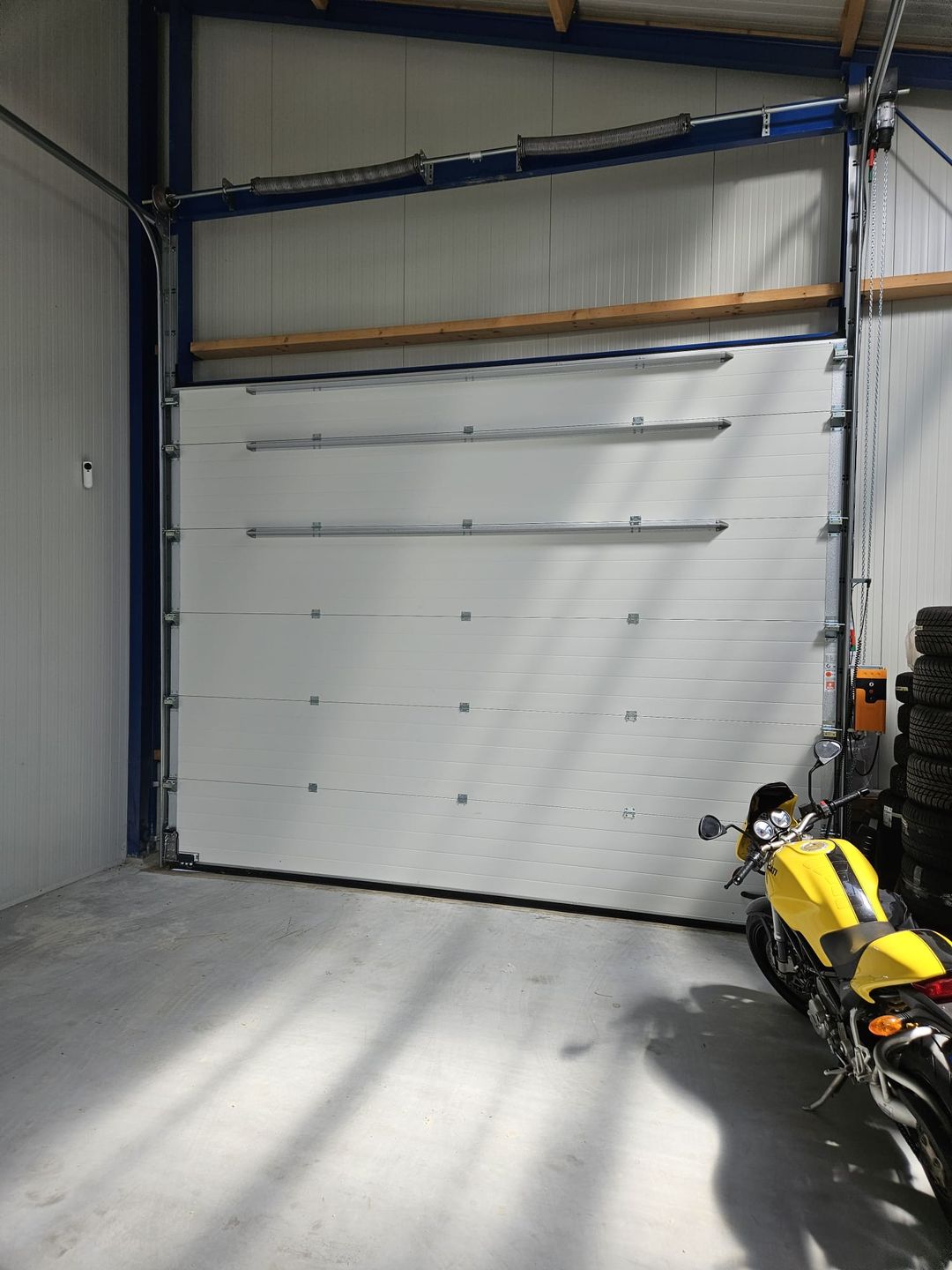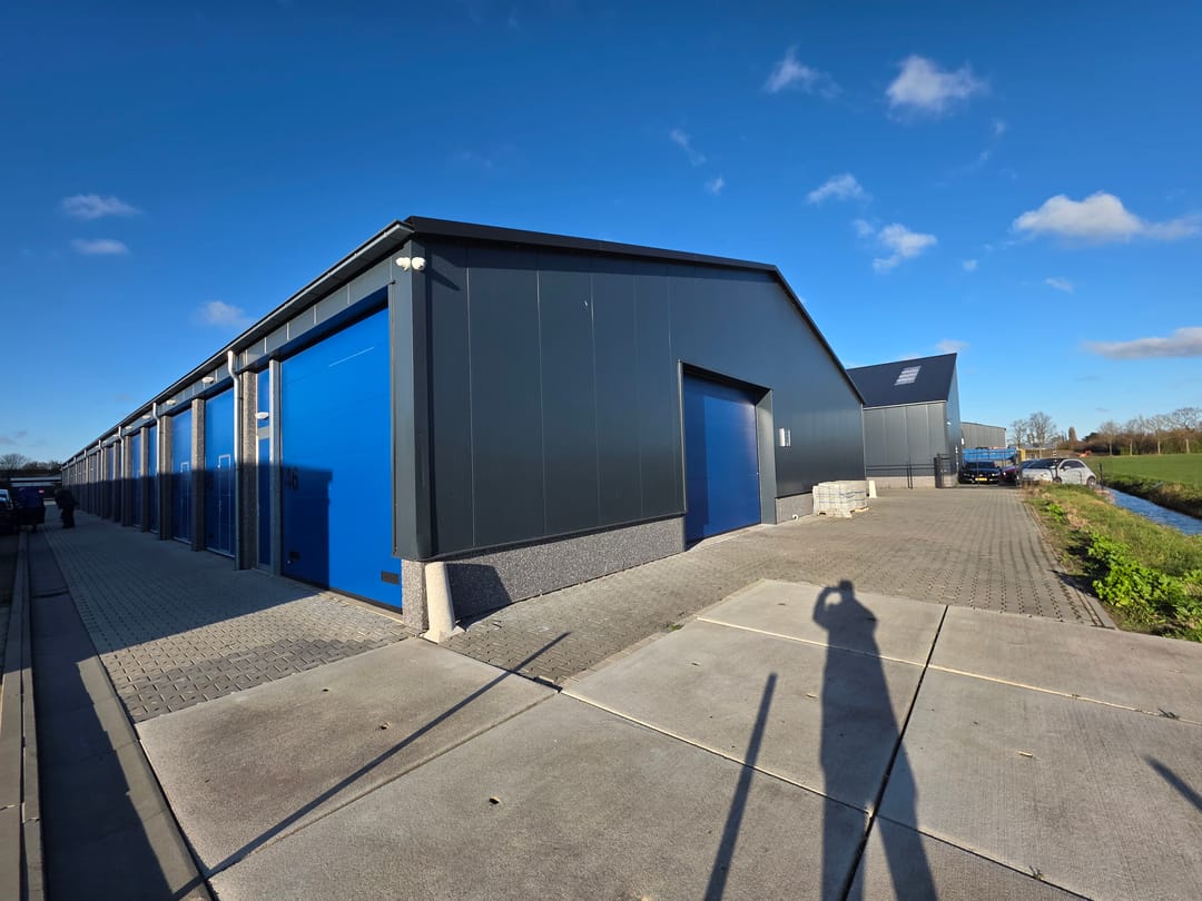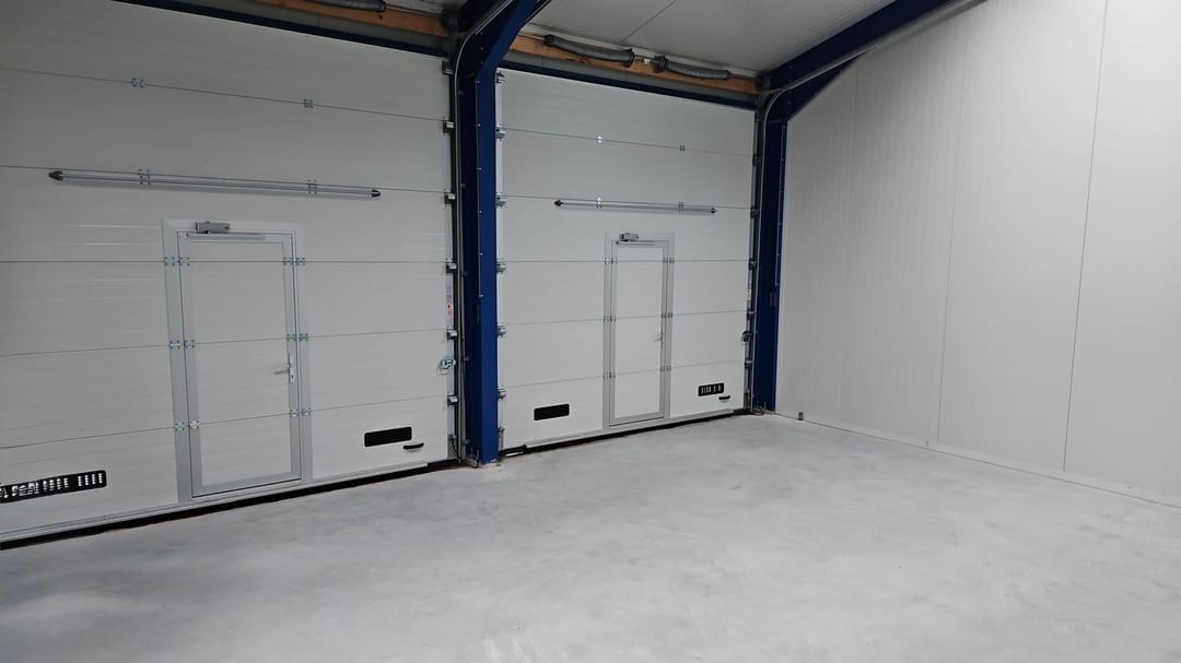 - Een elektrische overheaddeur op de kop, en 3 handmatige overheaddeuren 'in de rij'.