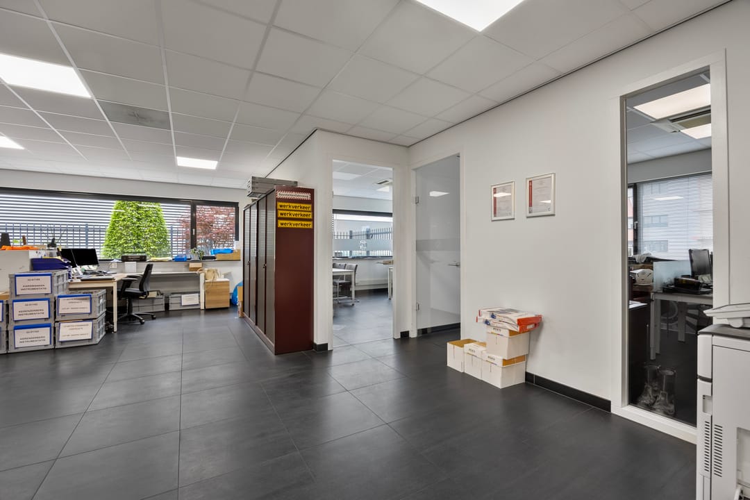 Entree met ontvangsthal met toegang tot sanitaire voorzieningen alsmede pantry, kantoortuin met 2-tal separate spreekkamers/vergaderkamers van ca. 260 m². De kantoorverdieping is redelijk gelijk aan de begane grond van eveneens ca. 260 m². Vanaf de begane grond toegang tot de bedrijfshal met kraanbaan van ca. 440 m². Vanaf de bedrijfshal toegang tot verhard terrein van 425 m² (afgesloten terrein). Totale metrage ca. 960 m² (exclusief buitenterrein).
