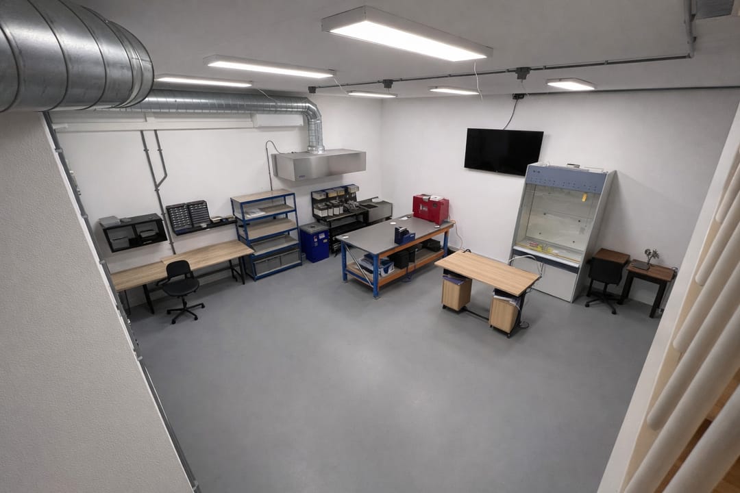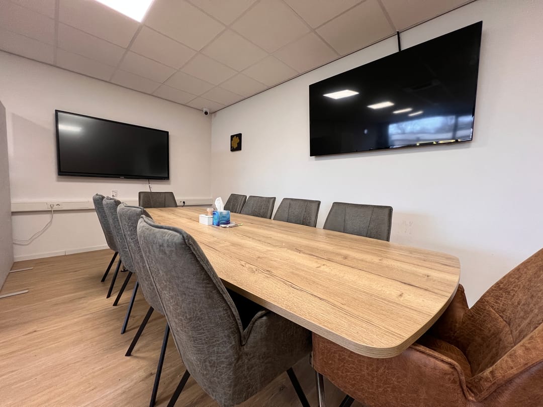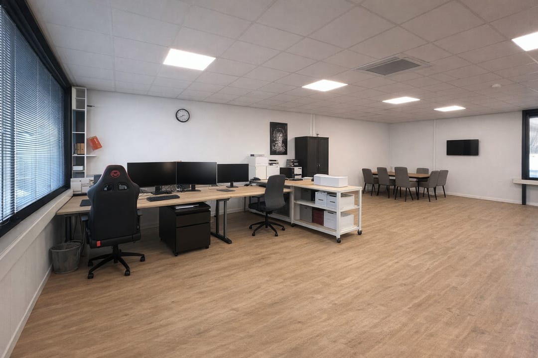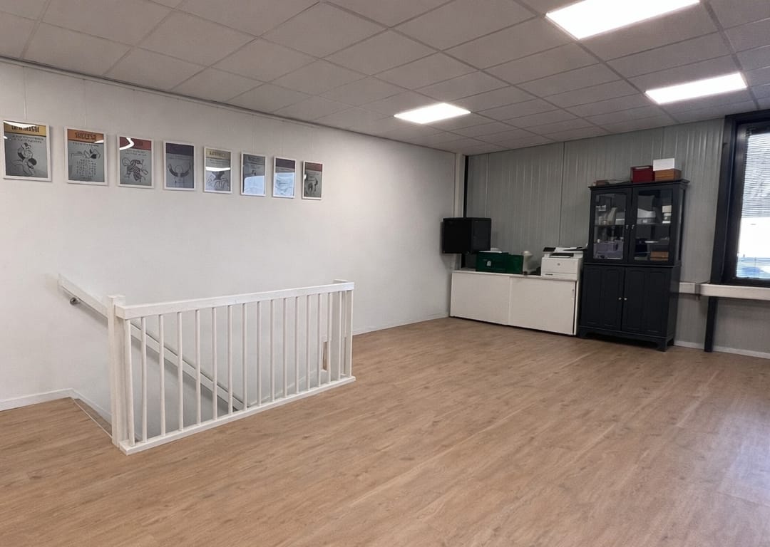 Op de eerste verdieping bevindt zich een moderne en representatieve kantoorruimte van circa 75 m². Deze verdieping is afgewerkt met onder meer een laminaatvloer, systeemplafond met LED-verlichting, pantry, airco-installatie en 24 zonnepanelen op het dak.