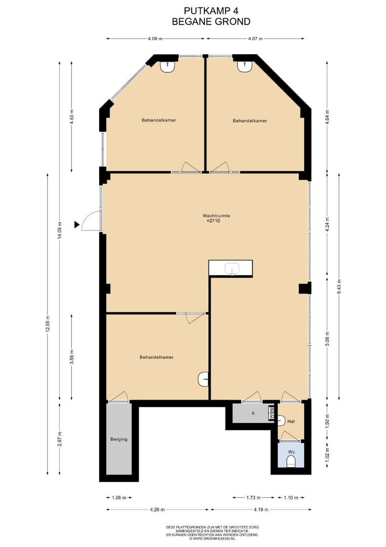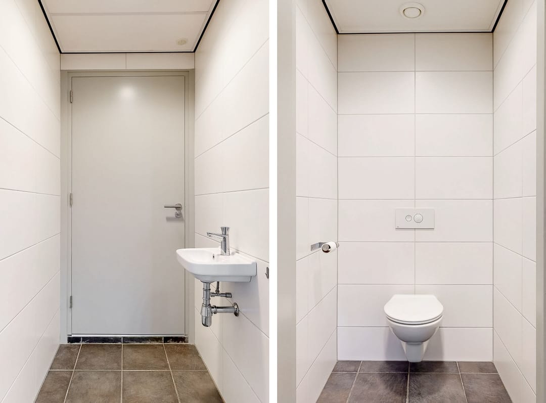 Via de entree bereikt u een centrale wachtruimte, waarin tevens een pantry is opgenomen. Vanuit deze wachtruimte zijn drie afzonderlijke behandelruimtes toegankelijk. Eén van de behandelruimtes beschikt over een eigen berging. Alle behandelruimtes zijn voorzien van een wateraansluiting met kraan. Daarnaast is er een aparte toiletruimte met fonteintje aanwezig. De ruimte is uitgerust met vloerverwarming en beschikt over drie airco-units.
