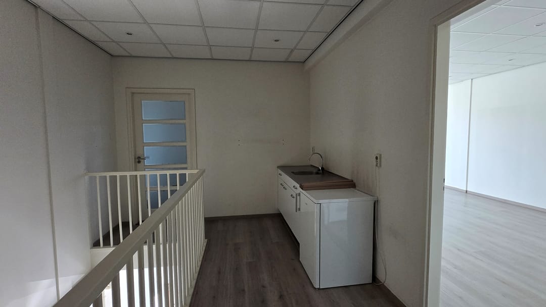Ruime overloop met keukenblok (ca. 6,00 × 3,15 m) en vier separate kantoorruimten waarvan 3 met airco-installatie en spot verlichting: