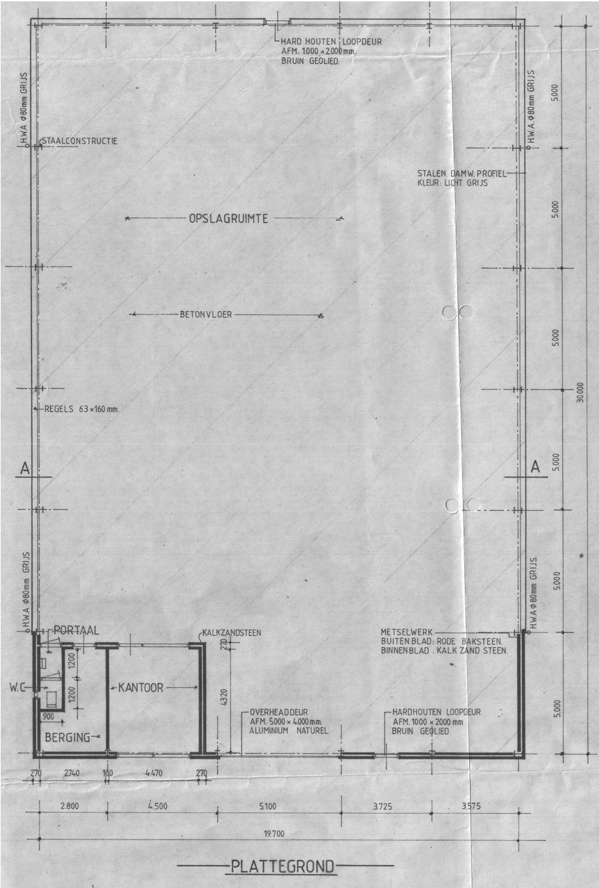Begane grond: Overheaddeur en separate loopdeur aan de voorzijde van het pand. Via deze overheaddeur en loopdeur toegang naar de hal. Grote bedrijfshal van circa 556 m2 met betonvloer en loopdeur met toegang naar het achter- en naastgelegen terrein. Vanuit bedrijfshal toegang naar een separate kantoorruimte van circa 19 m2. Separate bergruimte met opstelling meters. Separate toiletruimte met toilet en fontein.