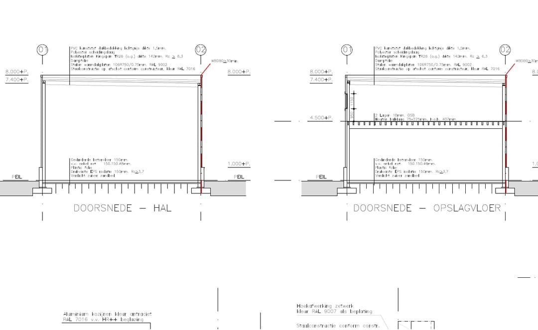 · de vrije hoogte onder de staalconstructie is minimaal 7,1 meter, onder de dakconstructie is die minimaal 7,4 meter. De verdiepingsvloer zit op 4,5 meter + peil.