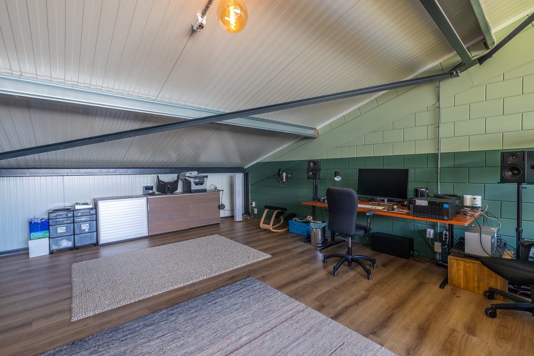 Verdieping: circa 60m² v.v.o. alwaar kantoor met laminaatvloer, keukenblok, toilet en airconditioning.
