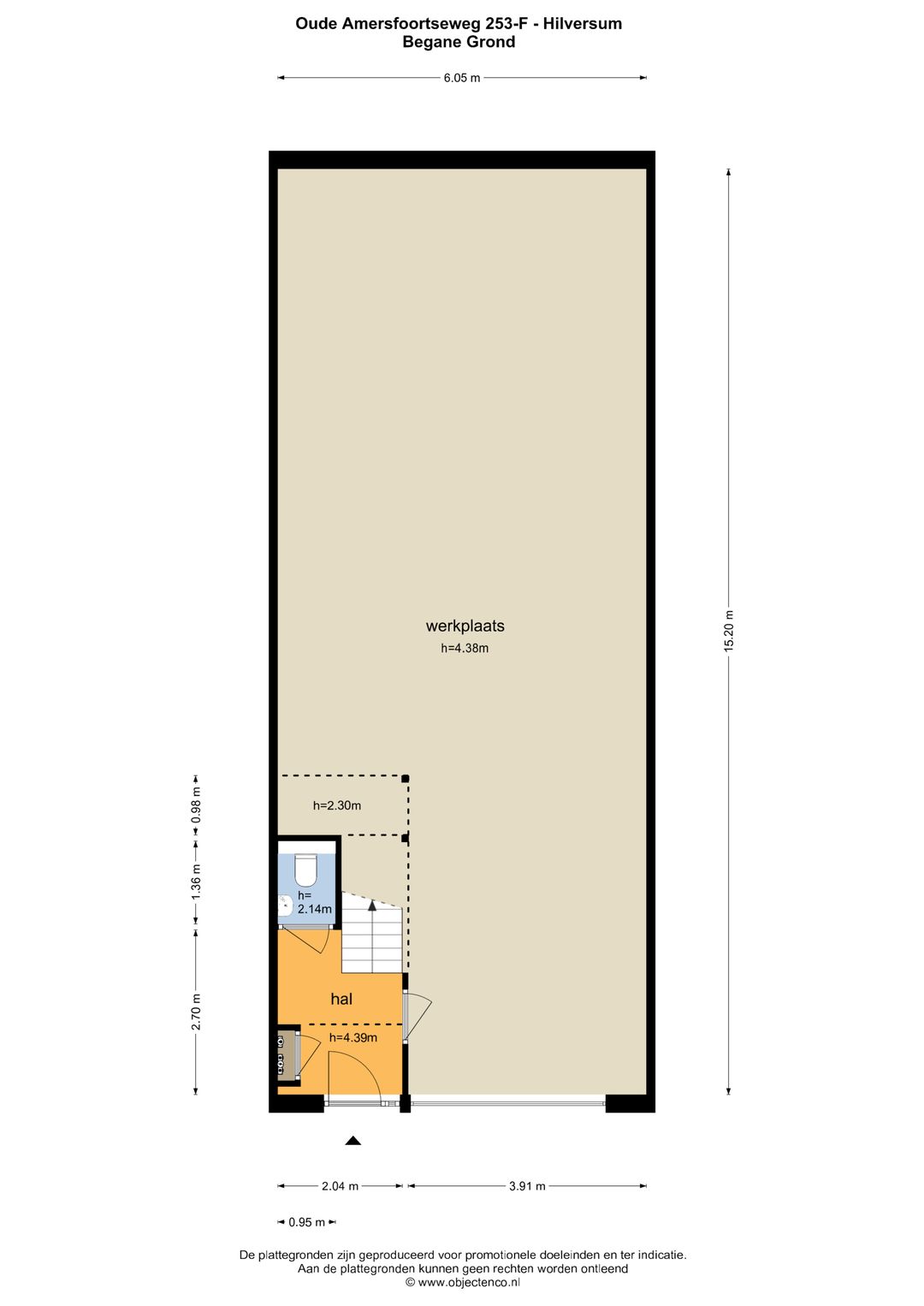 Begane grond: Entree, meterkast, hal met toilet, bordestrap naar verdieping en separate deur naar de bedrijfsruimte van circa 85m² v.v.o. voorzien van overheaddeur