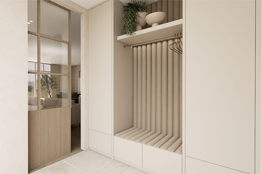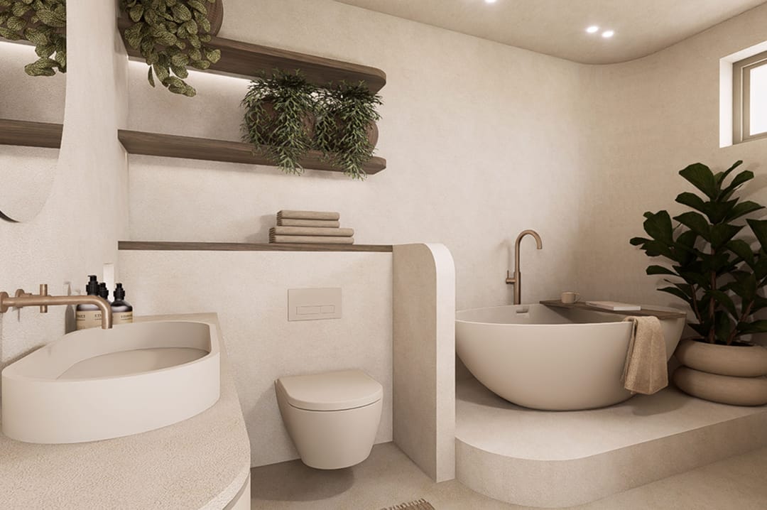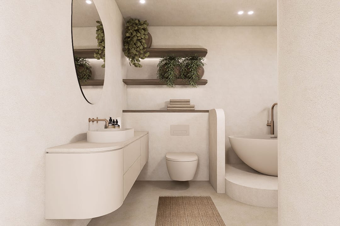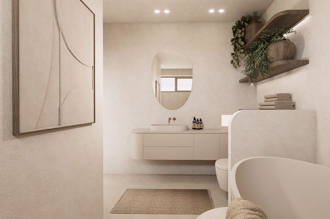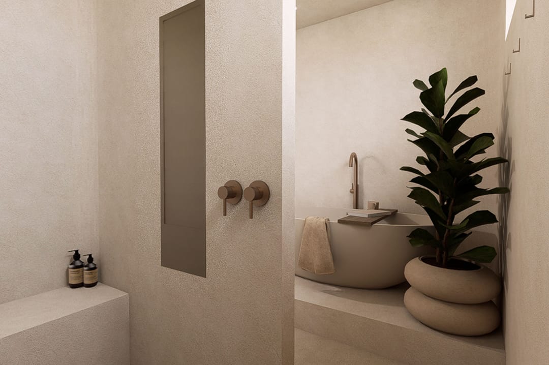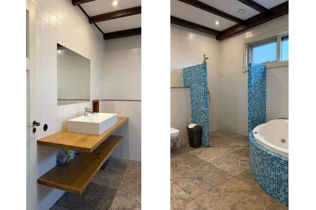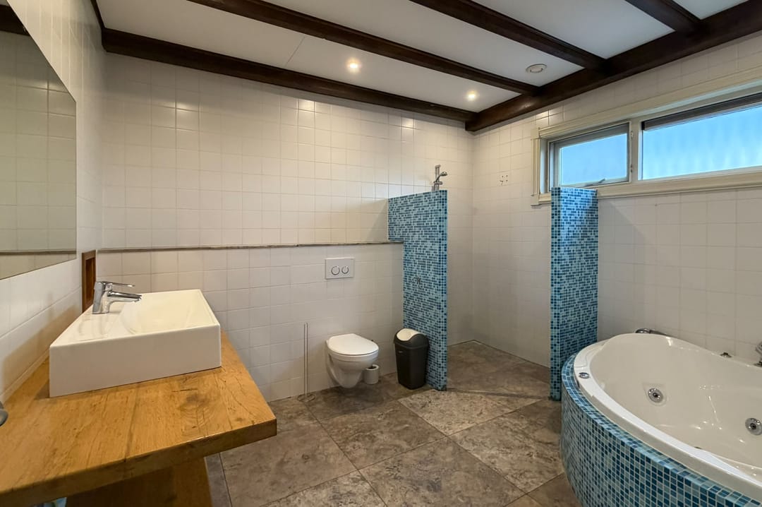 De badkamer is royaal van opzet en voorzien van alle gewenste faciliteiten, waaronder een inloopdouche, een groot wastafelmeubel en een toilet. Tevens bestaat hier de mogelijkheid om een lig- of bubbelbad te realiseren.