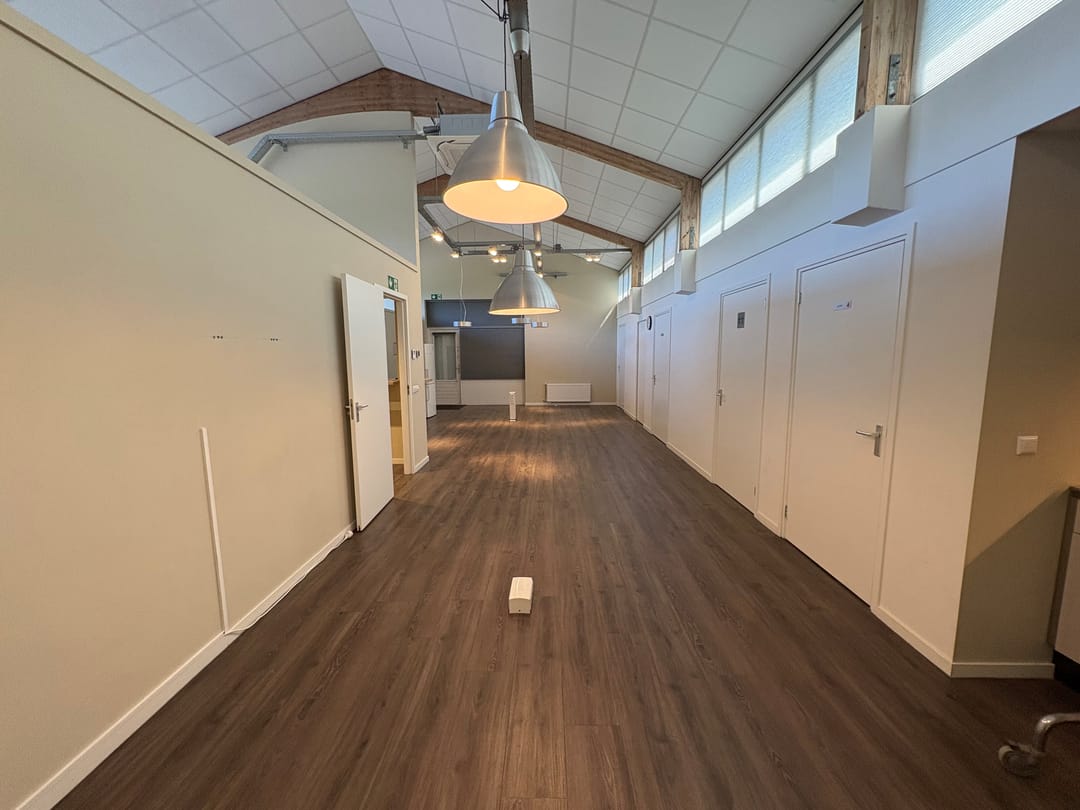 - Systeemplafond met industriële verlichting en kabelgoot in de grote open kantoorruimte;