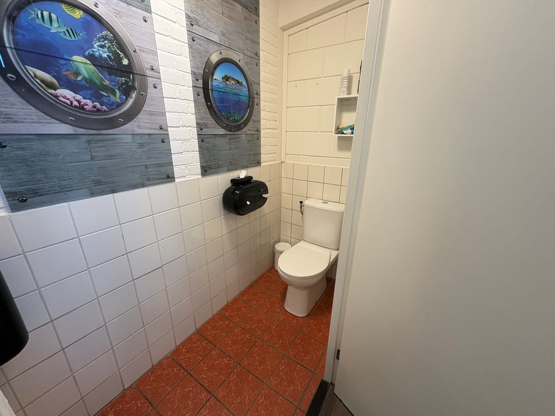 - Twee toiletgroepen met closet (staand model), plavuizen vloer en fonteintje;