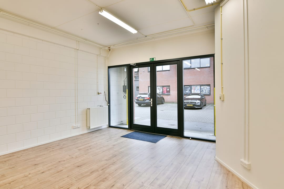 Begane grond: entree, hal, meterkast, toilet, de bedrijfsruimte op de begane grond is thans ingedeeld in kantoorruimte aan de voorzijde en een afgescheiden deel als opslag/printerruimte aan de achterzijde. Deze ruimte is voorzien van een afzuigsysteem. Achter de elektrische overheaddeur is een houten pui met openslaande deuren gerealiseerd, zodat deze ruimte als kantoor of showroom te gebruiken is.