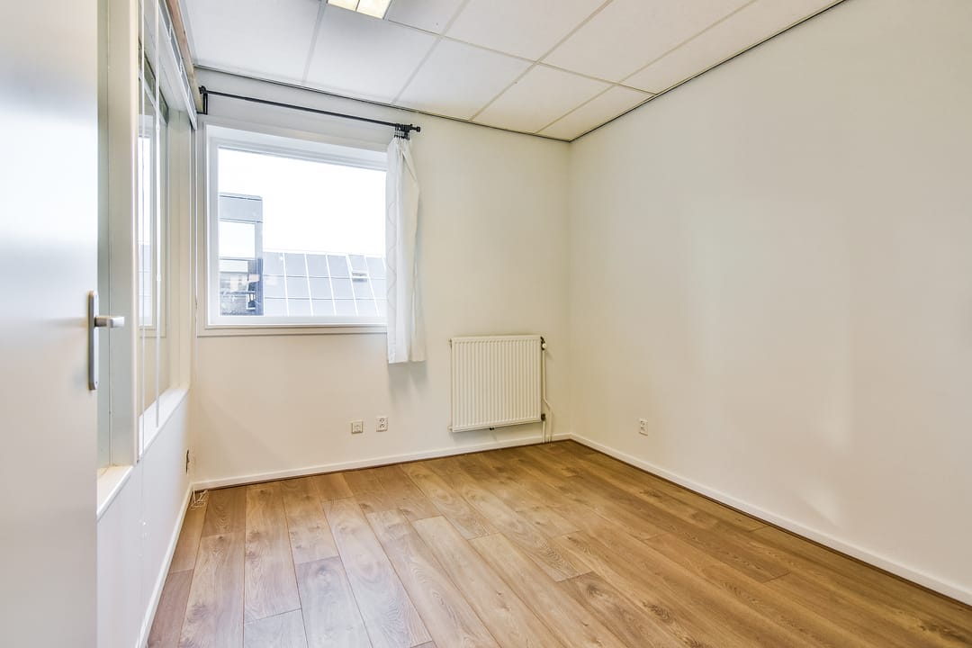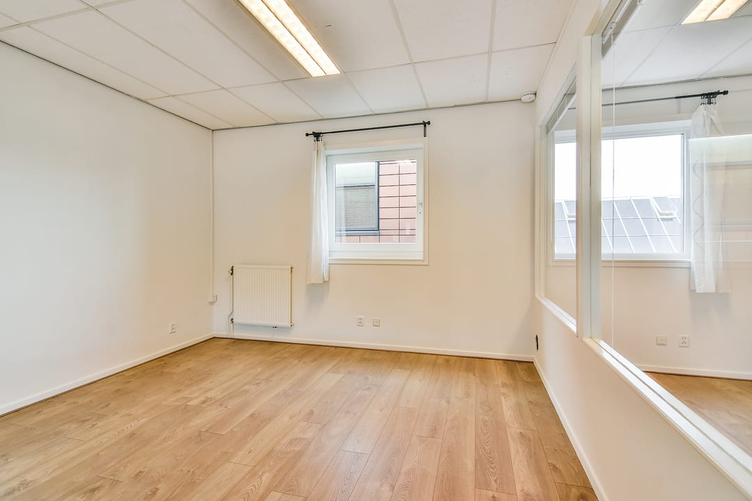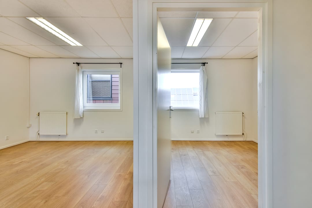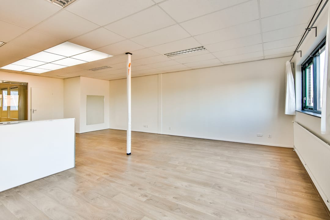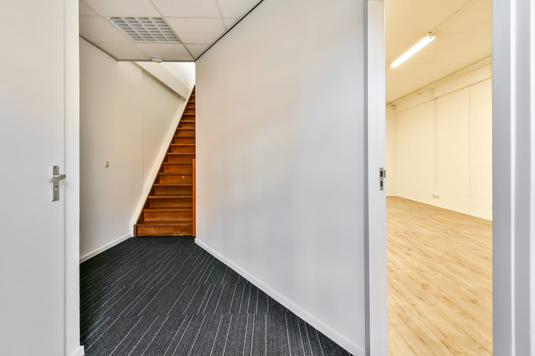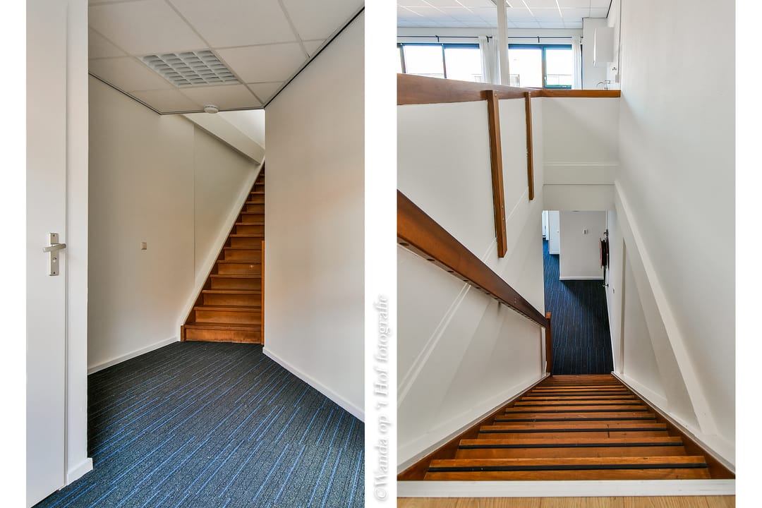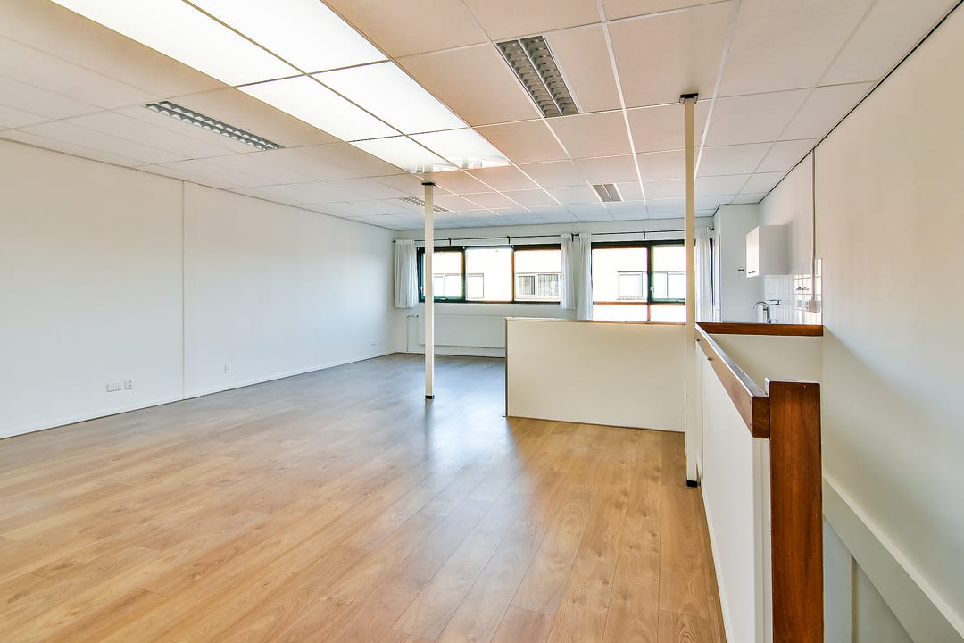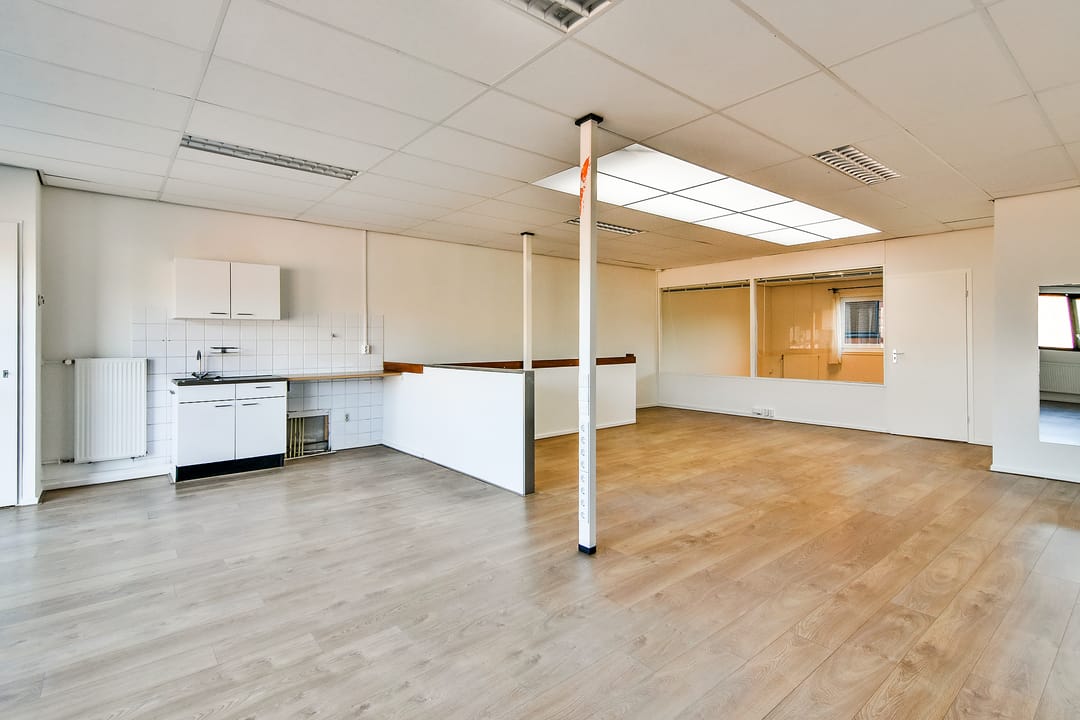 Eerste verdieping: open kantoorruimte aan de voorzijde, met lichtstraat en eenvoudig keukenblokje zonder apparatuur. CV-ruimte. Aan de achterzijde van het pand zijn twee kantoorruimtes en een bergkast.