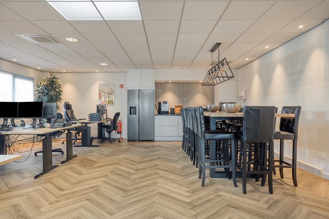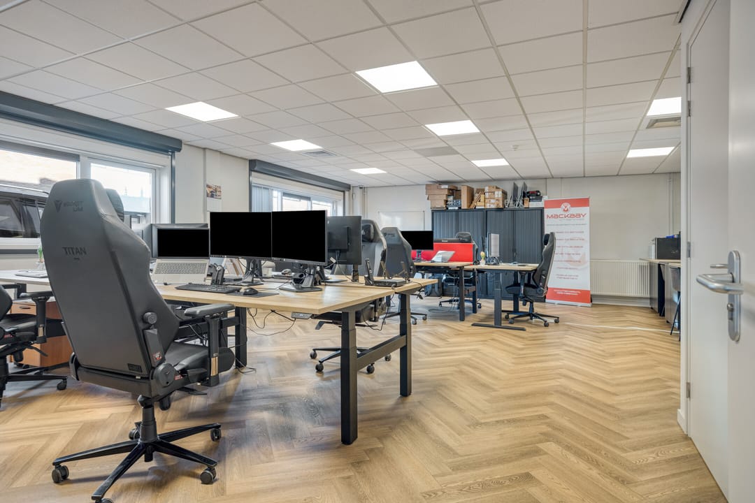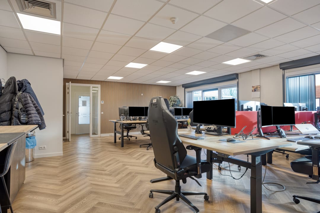 Op de begane grond bevindt zich een compacte opslagruimte met overheaddeur. Het overige deel van de begane grond en de verdiepingsvloer zijn ingericht als moderne, lichte kantoorruimte met alle benodigde voorzieningen. De hoekligging zorgt voor goede zichtbaarheid en een representatieve uitstraling. Geschikt voor diverse zakelijke gebruikers, zoals dienstverleners, ICT-bedrijven, advieskantoren of combinatie kantoor/lichte bedrijfsvoering.