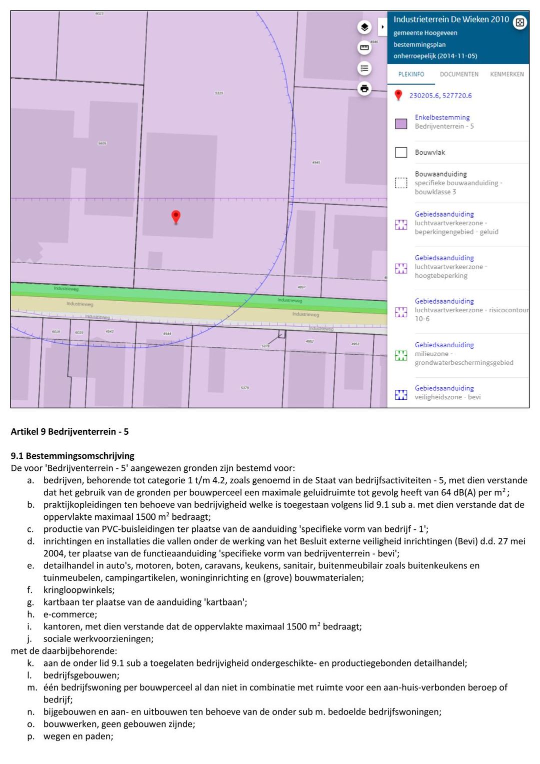 Bestemmingsplan De Wieken 2010, vastgesteld op 5 november 2014. Deze locatie heeft daarin de bestemming Bedrijventerrein-5. De hiervoor aangewezen gronden zijn bestemd voor: