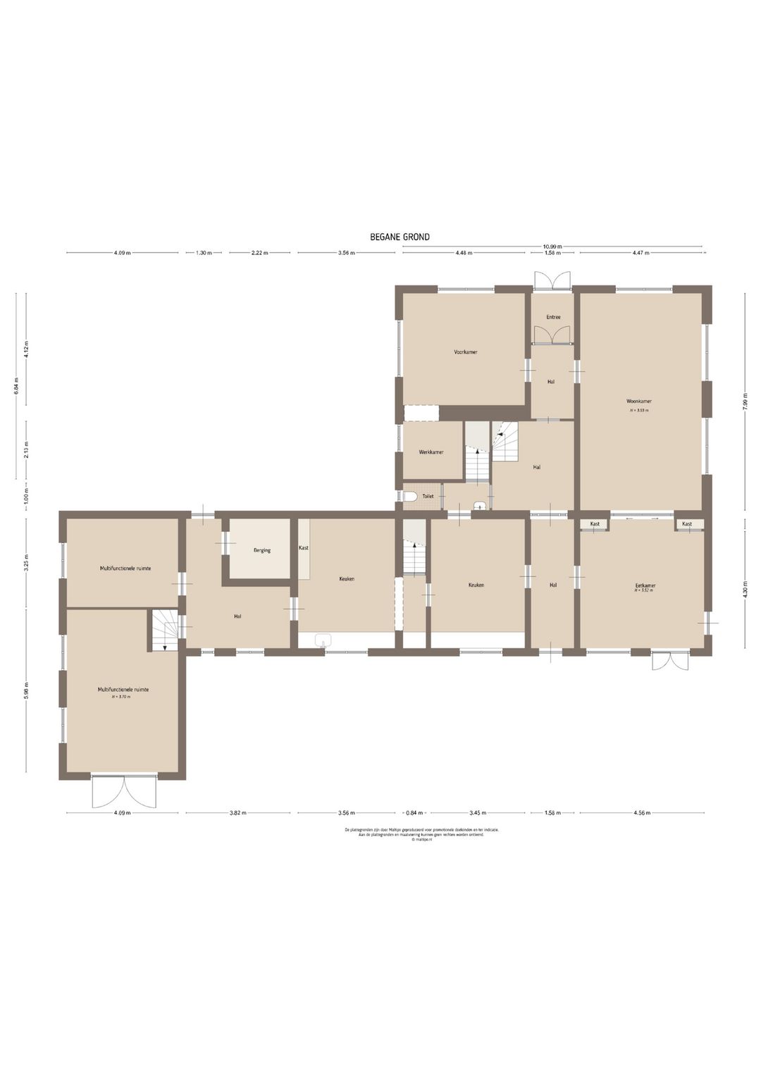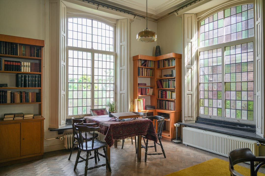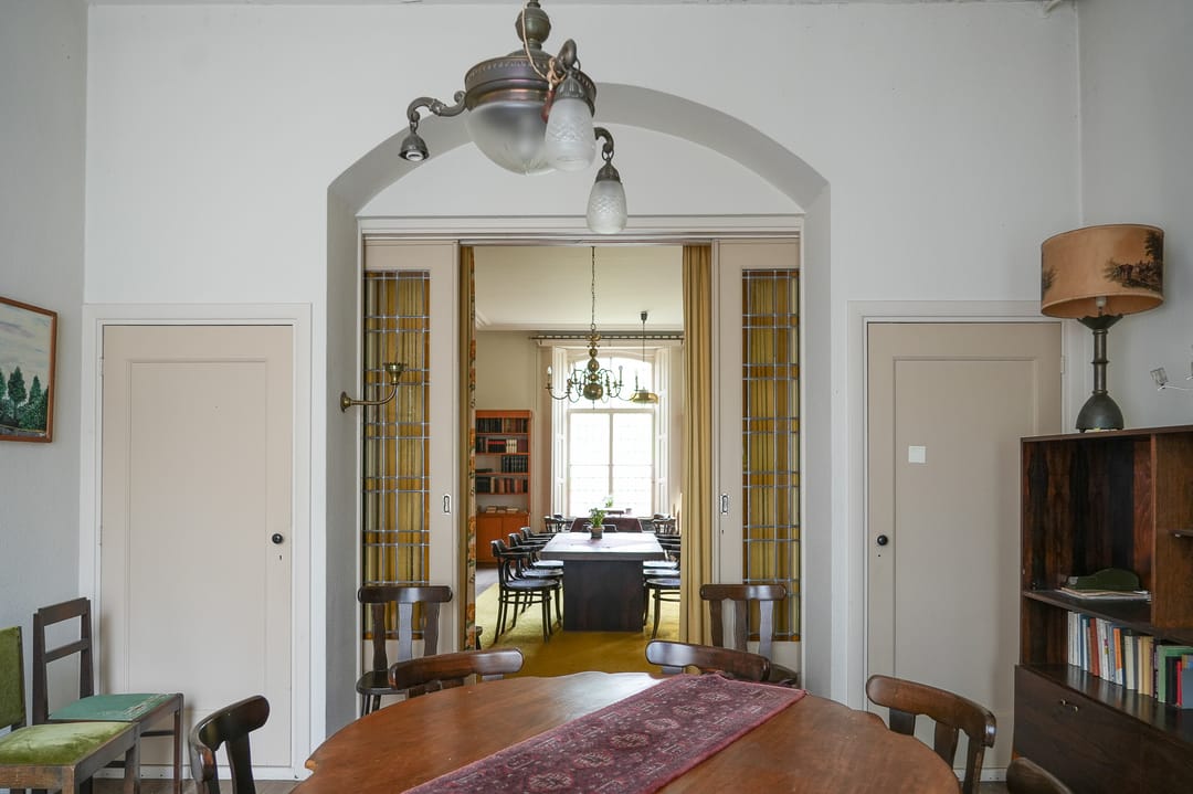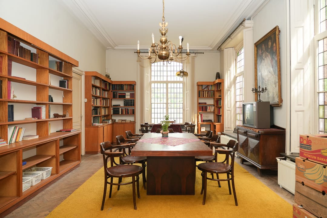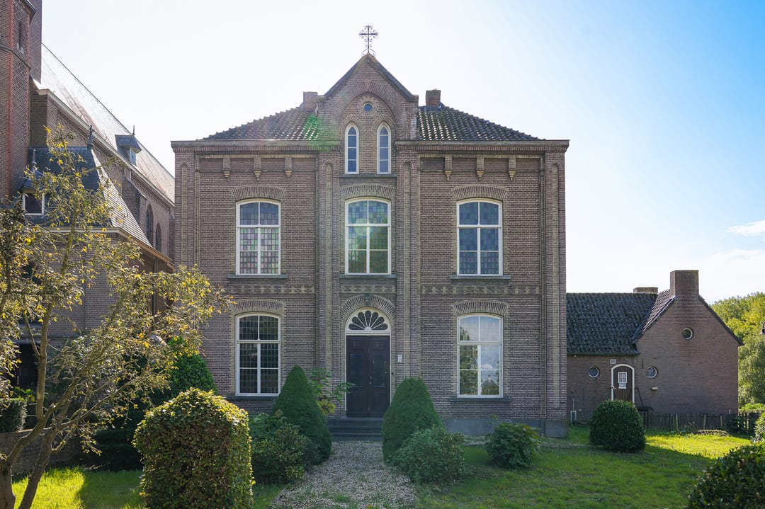 Pastorie: De hoofdentree van de pastorie is gelegen aan de voorzijde van het gebouw, vestibule, hal, ter weerszijden van de hal zijn twee kamers gelegen, kleinere zijkamer met parketvloer, openhaard, glas en lood ramen naar alle waarschijnlijkheid plafonds riet stuc. Grote kamer type en suite met kasten, parketvloer, deels luiken aan binnenzijde ramen, openslaande deuren naar het terras. Aan de achterzijde van de pastorie op de begane grond gelegen is de keuken met zwart witte tegelvloer, granieten aanrecht, houten kast met glasraampjes, schouw, toegang tot kelderruimtes. Tevens is aan de achterzijde gelegen mede bereikbaar via een eigen toegang hal, toilet, kantoor (gaskachel)en cv-kast. (Asbest deur naar kelder). Aangrenzend is de garage gelegen die momenteel is verbouwd naar gastenverblijf. In 1956 is het achterste gedeelte aangebouwd.