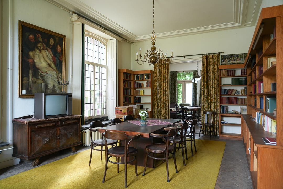 1e verd: Antikraak bewoond 1e en 2e verdieping gebruiken gezamenlijk met de parochie de achter entree, het terras en een gedeelte van de tuin. Via trap naar 1e verdieping overloop, aan de voorzijde zijn twee ruimtes gelegen van de pastorie; de woonkeuken met glas en lood ramen, keukenblok met betonnen aanrecht, 5 pits afzuigkap, koel/vriescombinatie, vaatwasser, houtenvloer, de woonkamer, vloer witgelakt, schouw en voorzetramen. In het deel gebouwd in 1956 zijn 2 slaapkamers gelegen, enkelgals en vaste kast, ouderslaapkamer met enkelglas. De 1e verdieping heeft een eigen cv-ketel en meterkast. Badkamer met een granietenvloer, douche, toilet voor de helft betegeld, natuurlijke ventilatie.