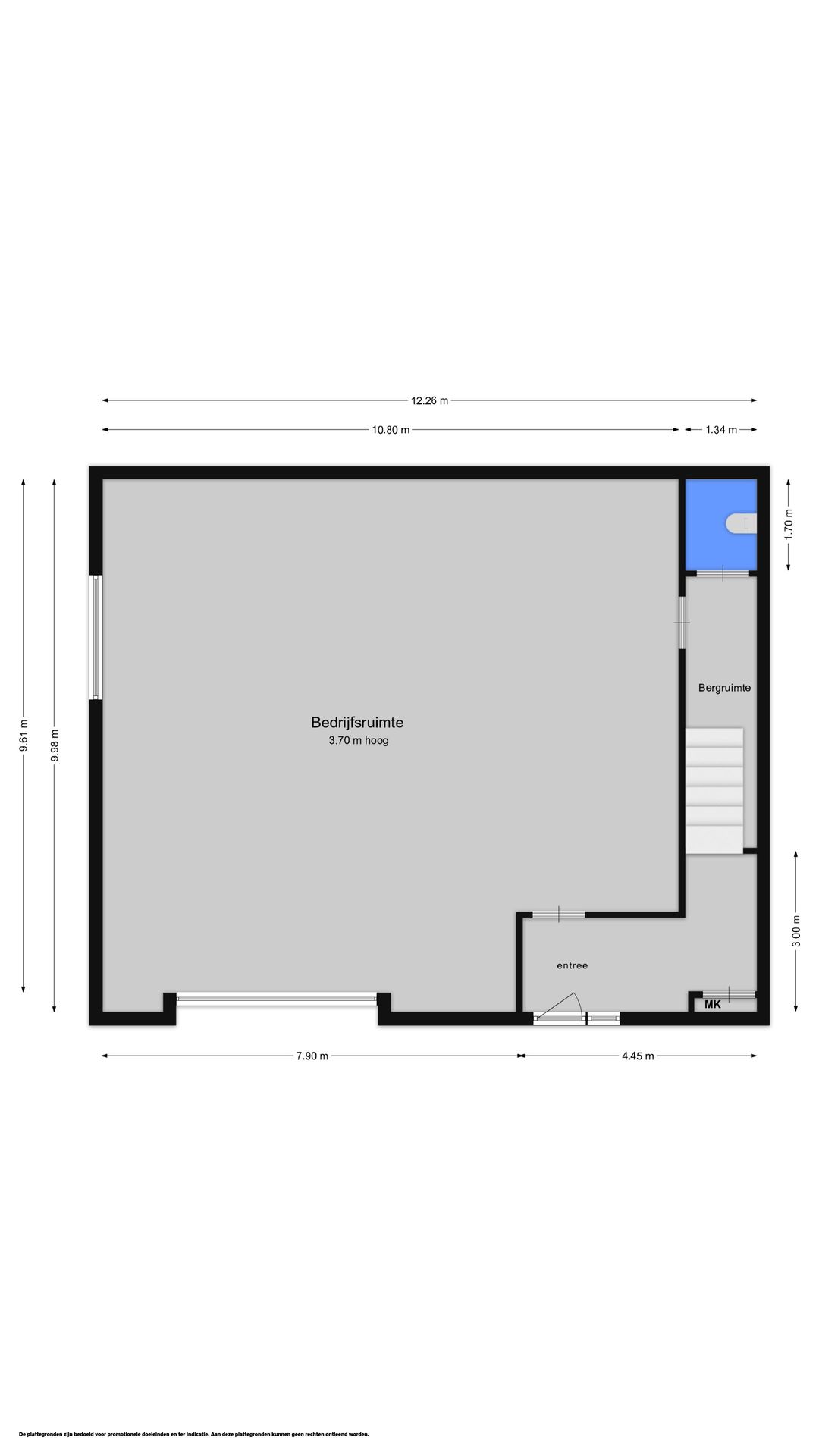 De begane grond (circa 119 m² VVO) beschikt over een entree aan de voorzijde van het object. Vanuit de entree is de bedrijfsruimte toegankelijk, welke een vrije hoogte heeft van circa 3,70 meter en daarmee geschikt is voor diverse bedrijfsactiviteiten. Op deze verdieping zijn tevens een berging en een toiletruimte aanwezig.
