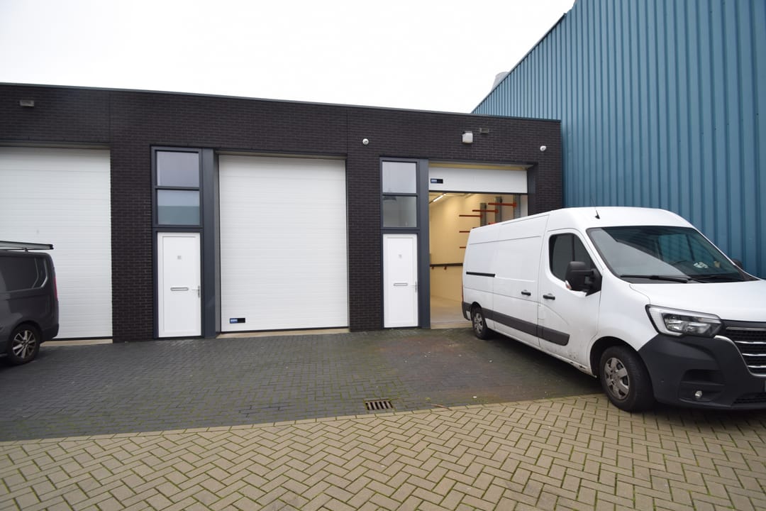 Moderne bedrijfshal met kantoorruimte op bedrijventerrein in IJmuiden