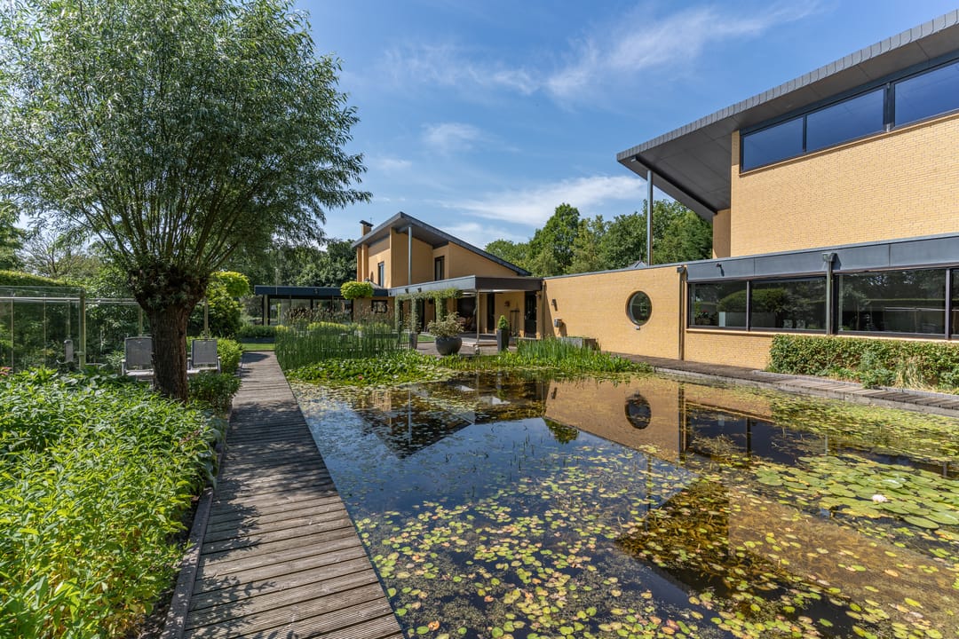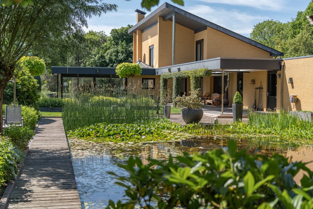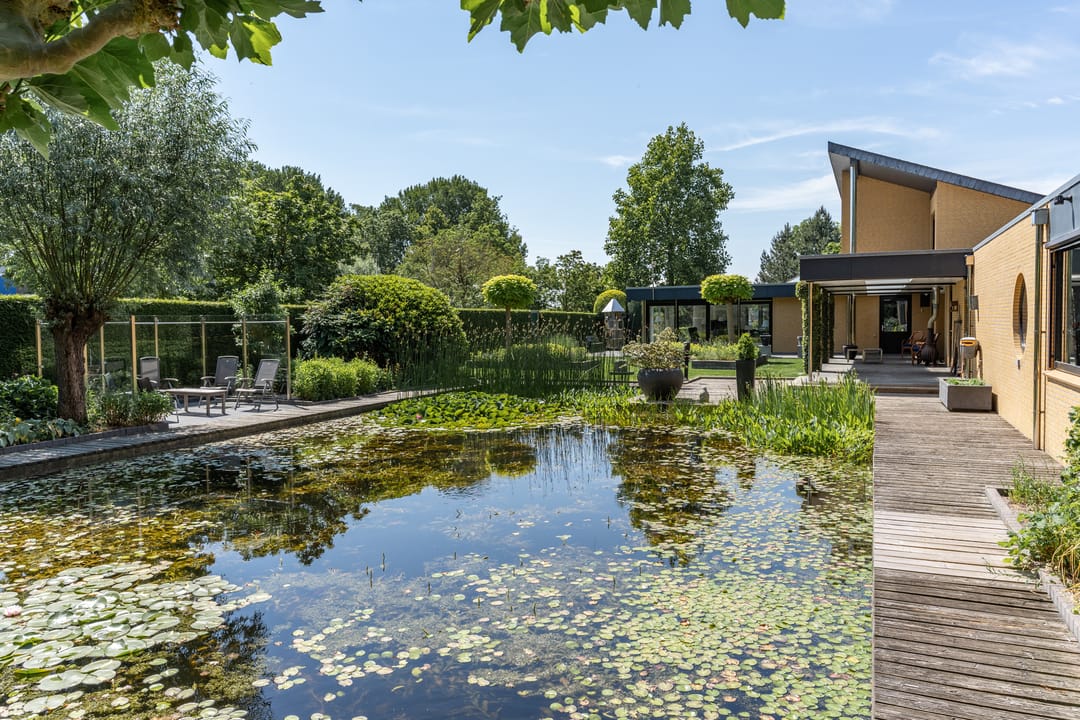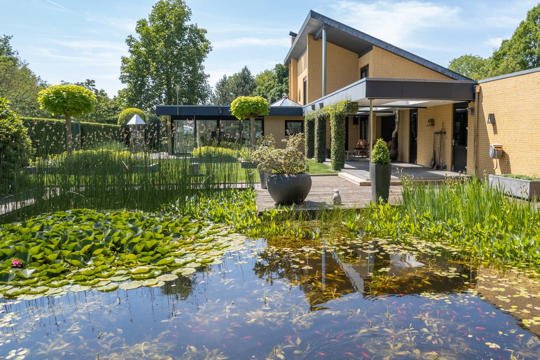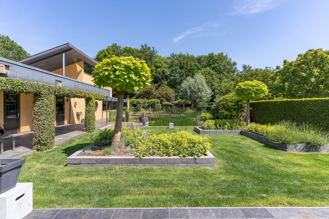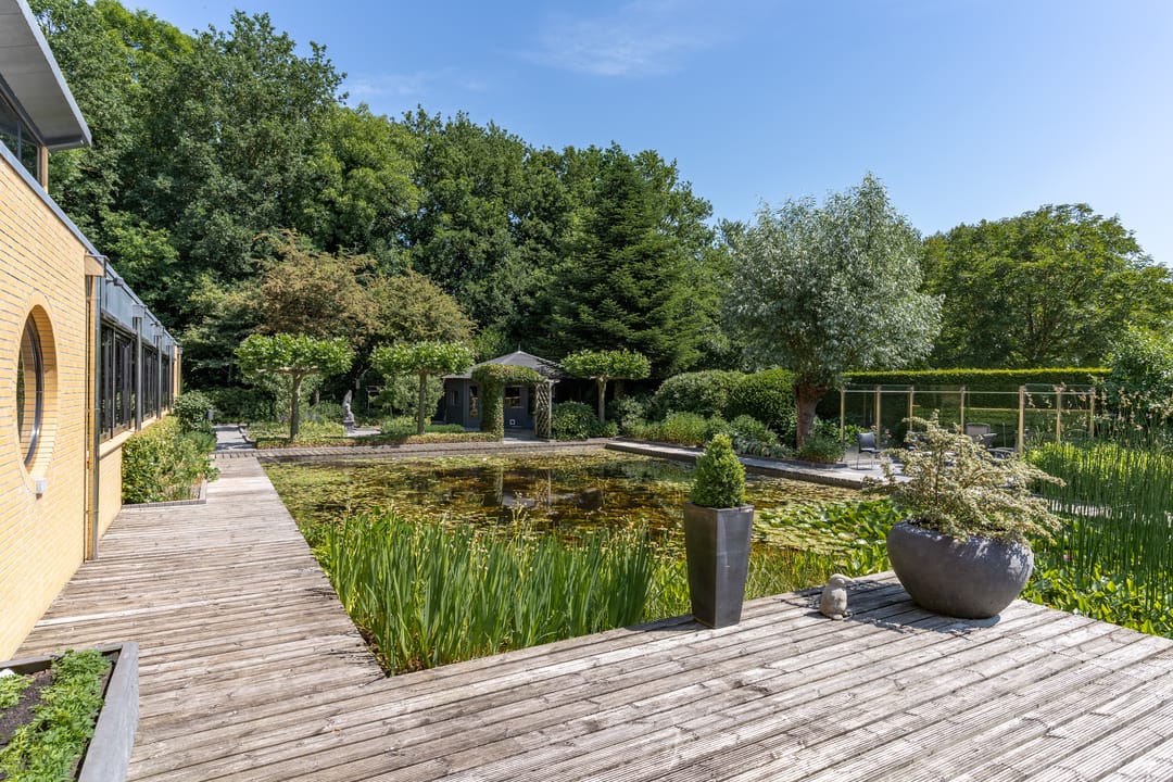 De buitenruimte verdient speciale aandacht. Rondom het huis ligt een prachtig aangelegde parkachtige tuin met verschillende terrassen, een grote vijver, fraaie sculpturen en een sfeervol tuinhuis. De tuin biedt rust, privacy en ruimte – perfect voor een borrel onder de veranda, een tuinfeest of gewoon een goed boek in de zon. Ook praktisch is alles tot in de puntjes geregeld: een ruime berging met extra keuken en plaats voor fietsen, gereedschap en tuinspullen.