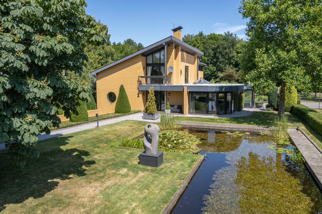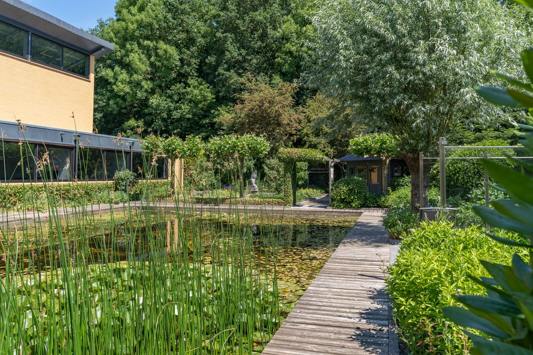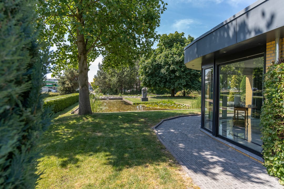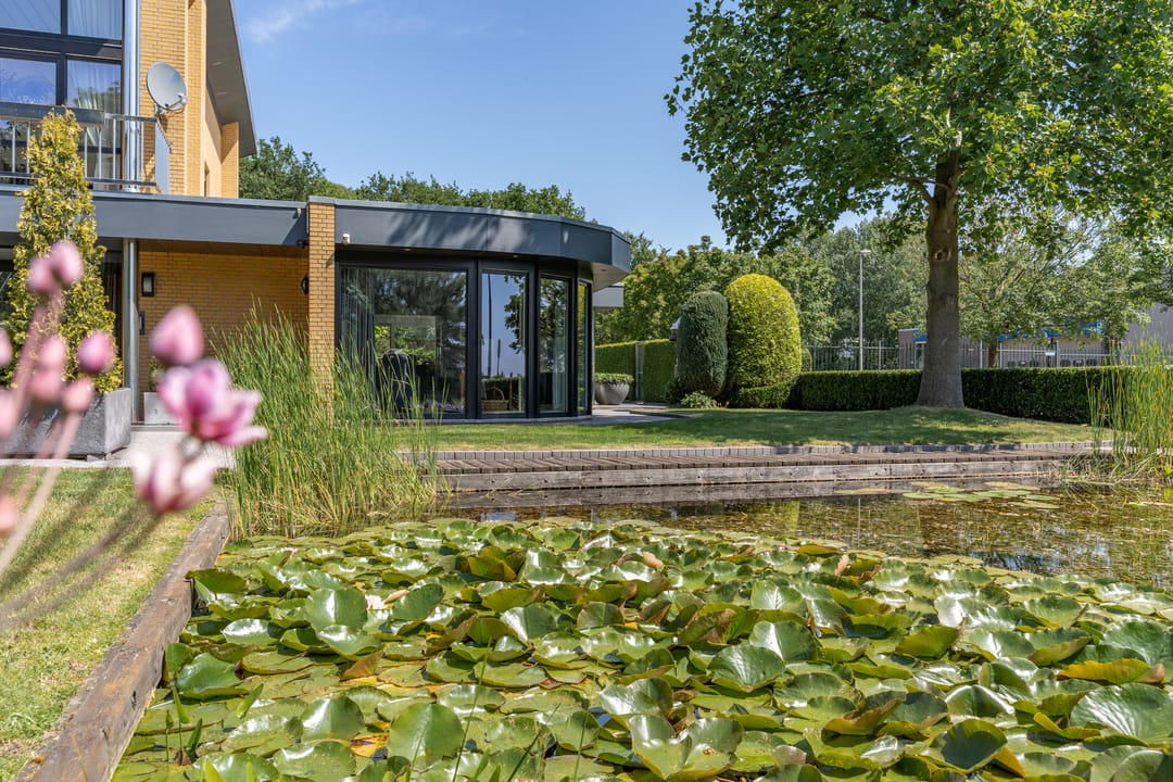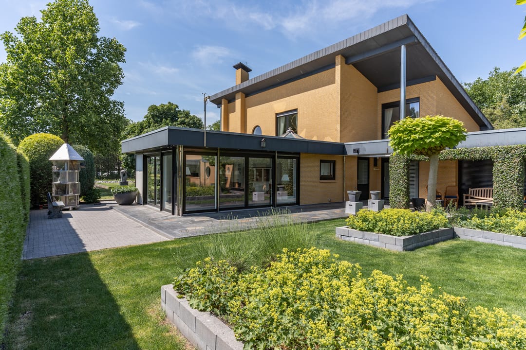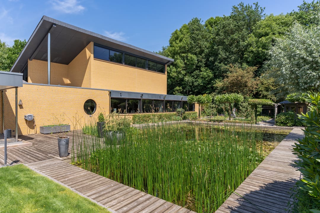 De buitenruimte verdient speciale aandacht. Rondom het huis ligt een prachtig aangelegde parkachtige tuin met verschillende terrassen, een grote vijver, fraaie sculpturen en een sfeervol tuinhuis. De tuin biedt rust, privacy en ruimte – perfect voor een borrel onder de veranda, een tuinfeest of gewoon een goed boek in de zon. Ook praktisch is alles tot in de puntjes geregeld: een ruime berging met extra keuken en plaats voor fietsen, gereedschap en tuinspullen.