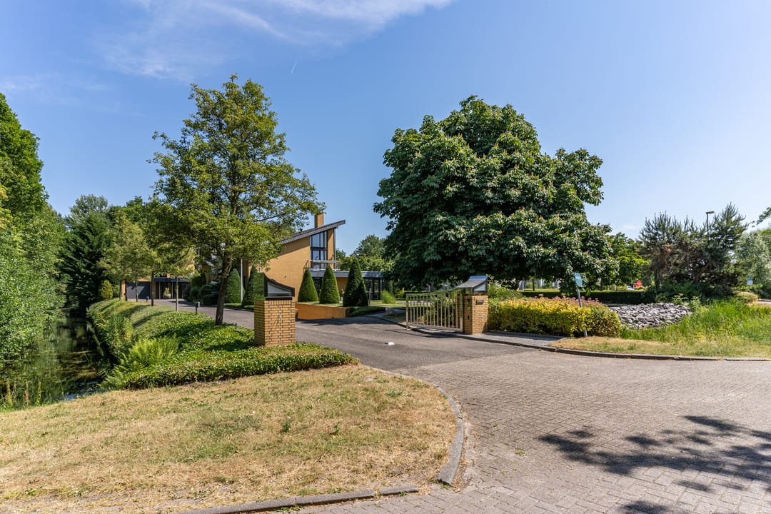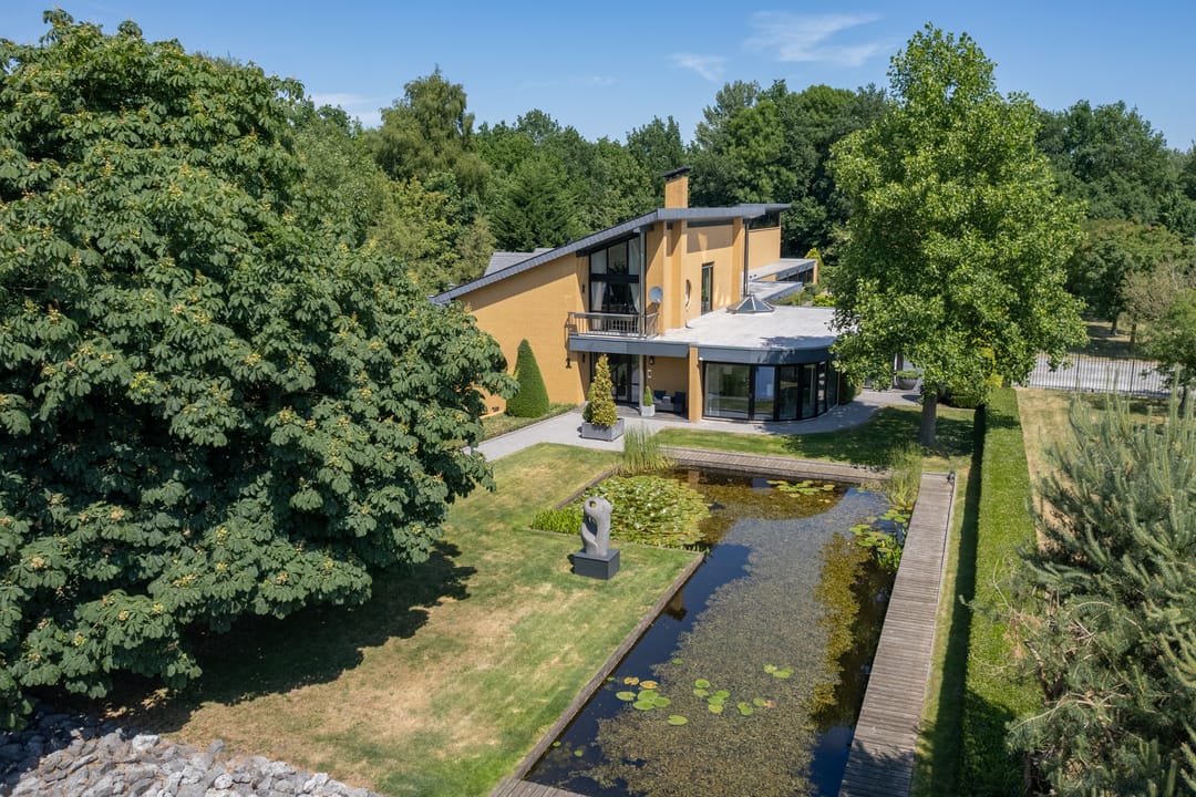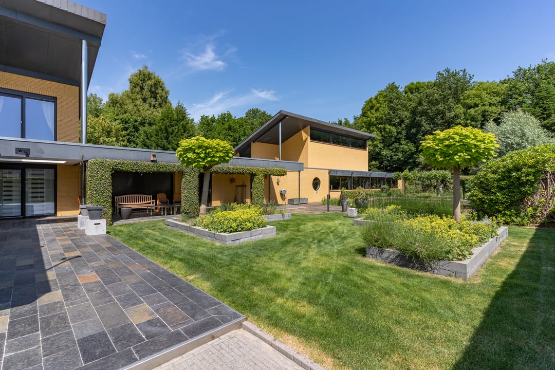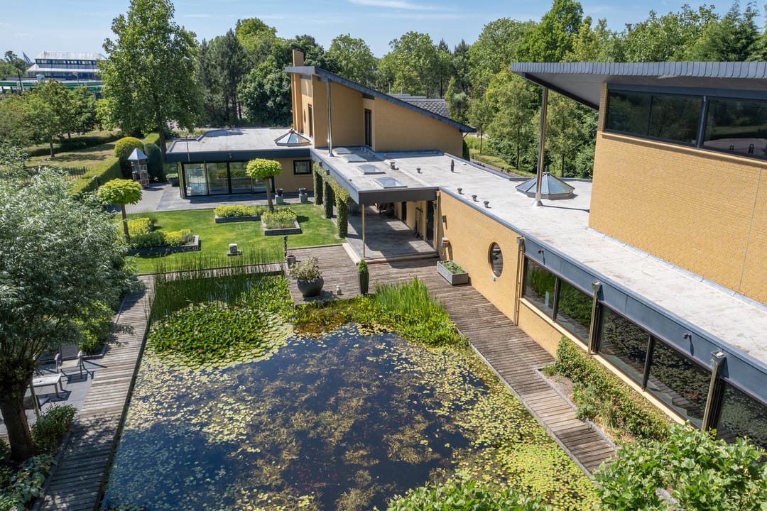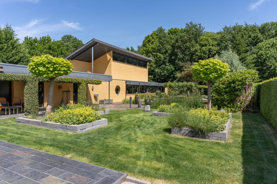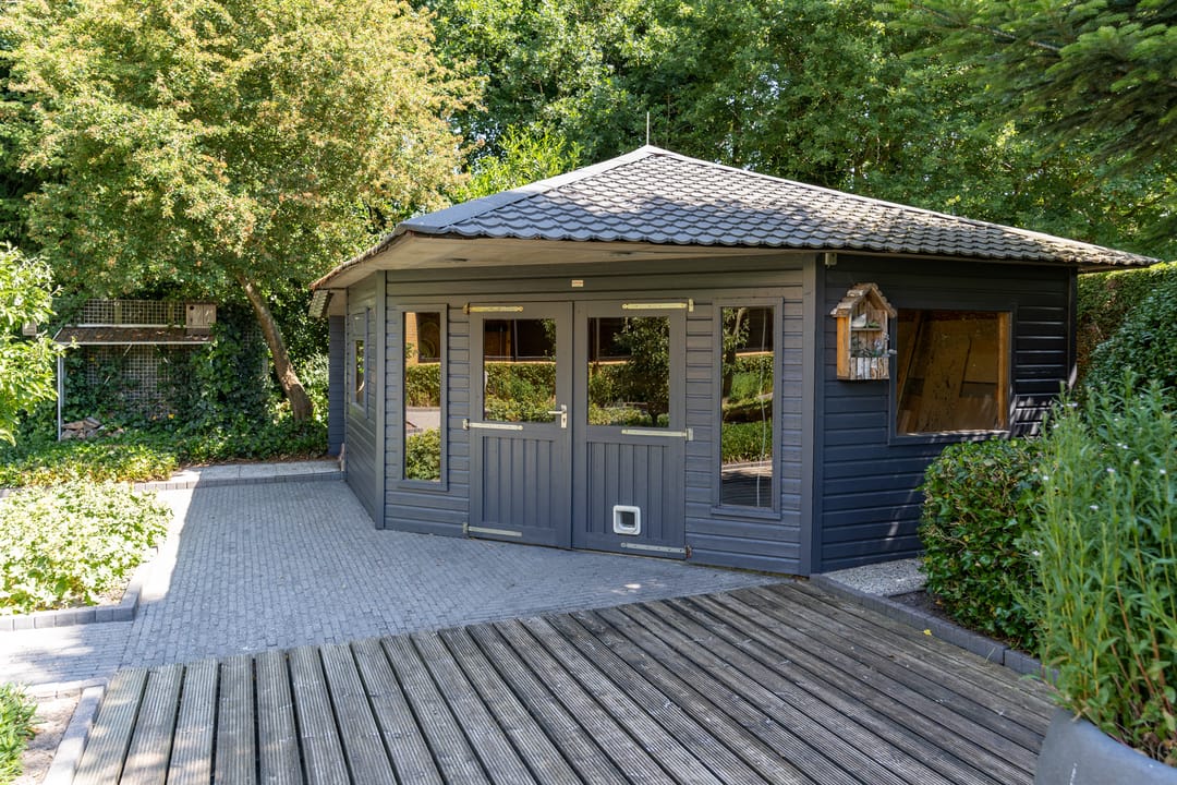 De buitenruimte verdient speciale aandacht. Rondom het huis ligt een prachtig aangelegde parkachtige tuin met verschillende terrassen, een grote vijver, fraaie sculpturen en een sfeervol tuinhuis. De tuin biedt rust, privacy en ruimte – perfect voor een borrel onder de veranda, een tuinfeest of gewoon een goed boek in de zon. Ook praktisch is alles tot in de puntjes geregeld: een ruime berging met extra keuken en plaats voor fietsen, gereedschap en tuinspullen.