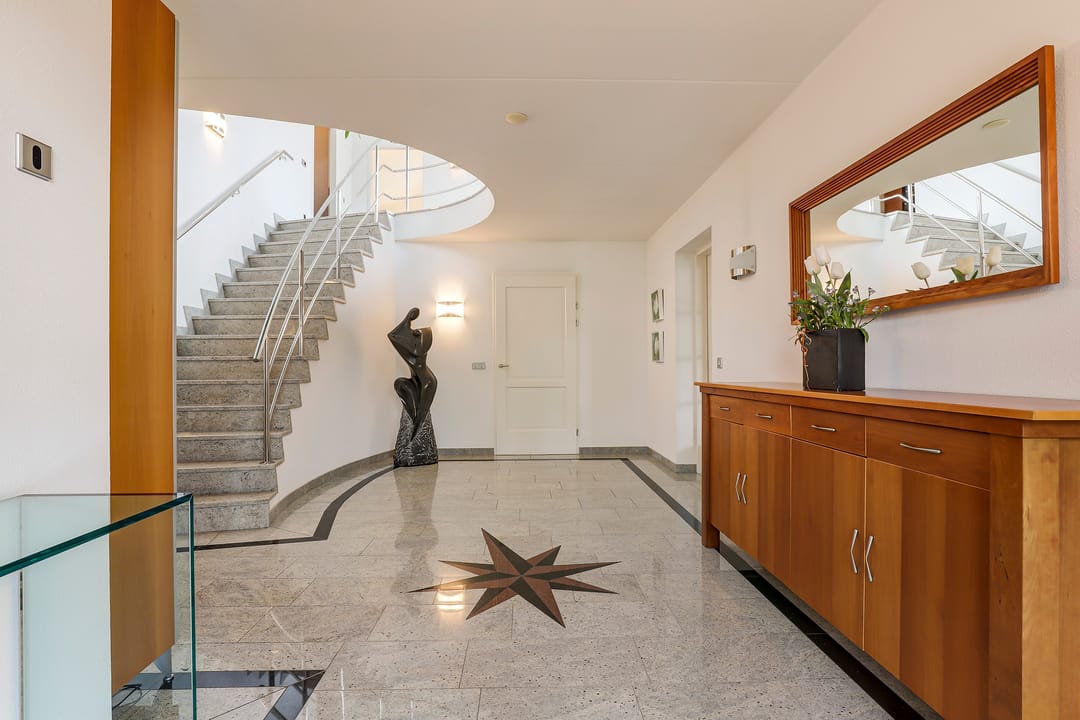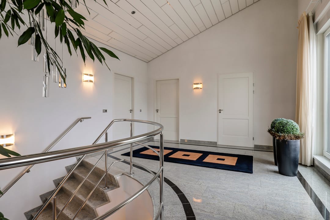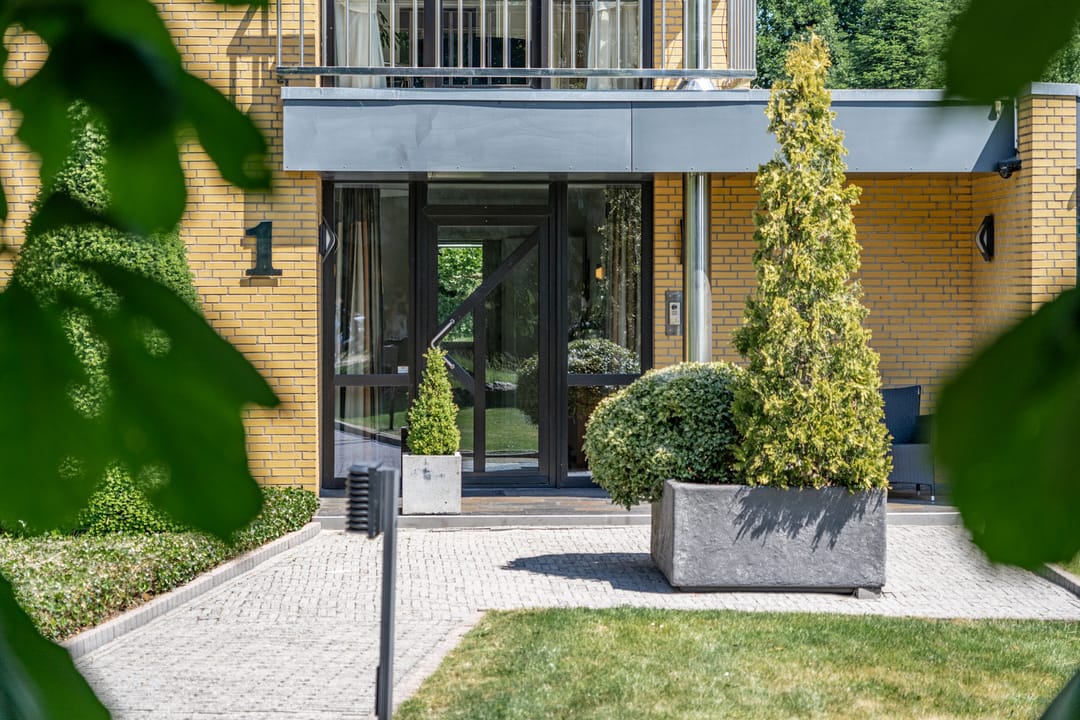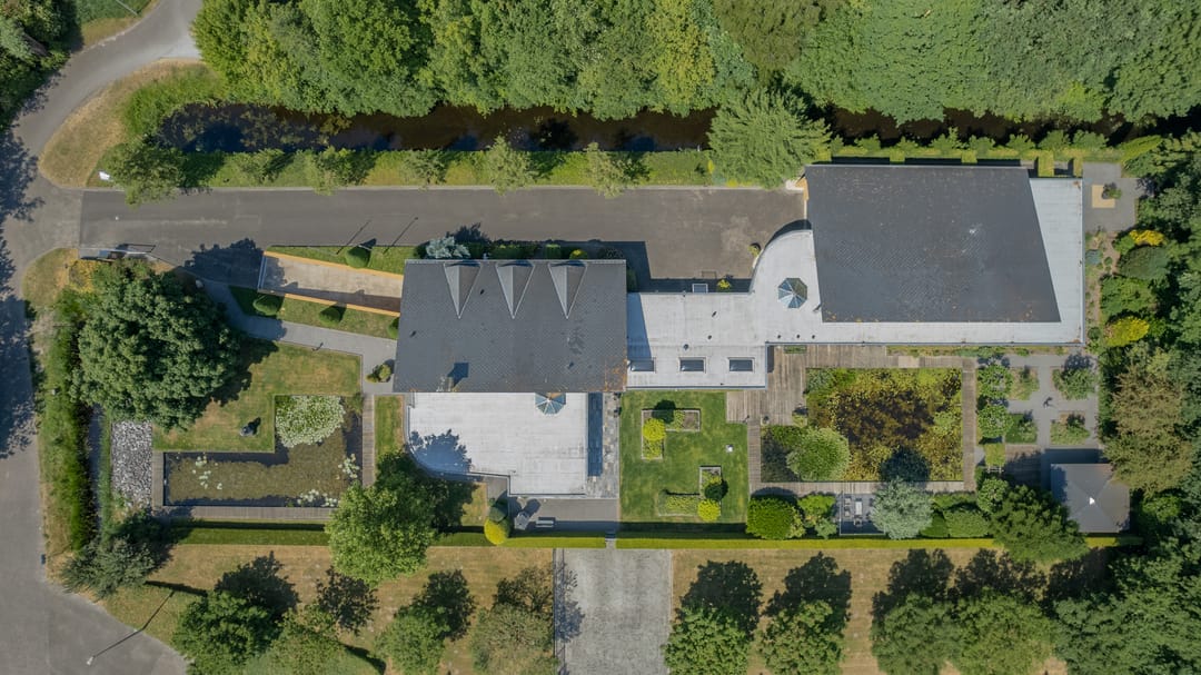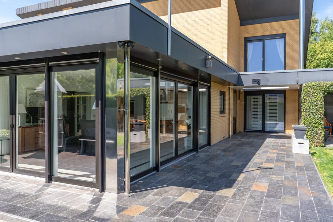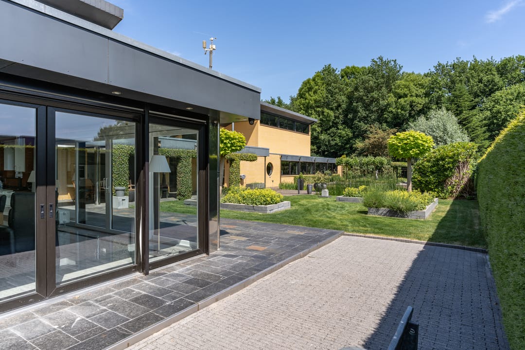De indrukwekkende hal met vide en ronde trapopgang vormt het hart van het huis. Vanuit hier bereik je zowel de werkkamer als de riante living met zicht op het groen rondom. En suite deuren leiden naar een eetkamer met luxe keuken en lichtkoepel. Grote schuifpuien verbinden binnen moeiteloos met buiten, waar een royale veranda en meerdere terrassen wachten op zonnige dagen of lange avonden met vrienden.