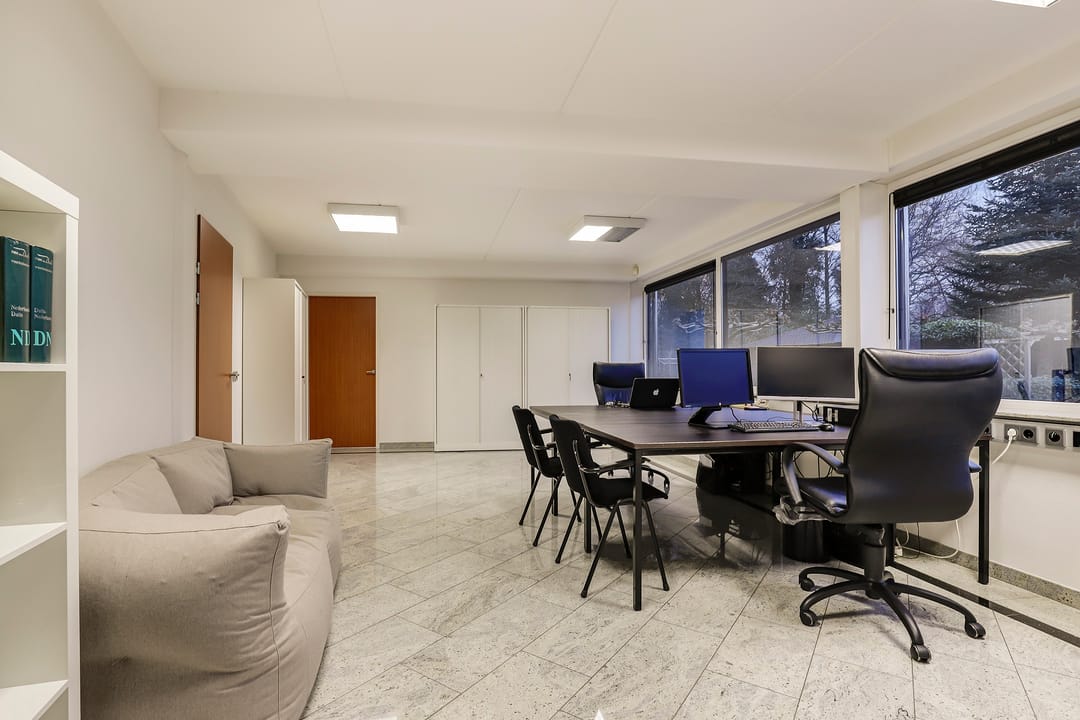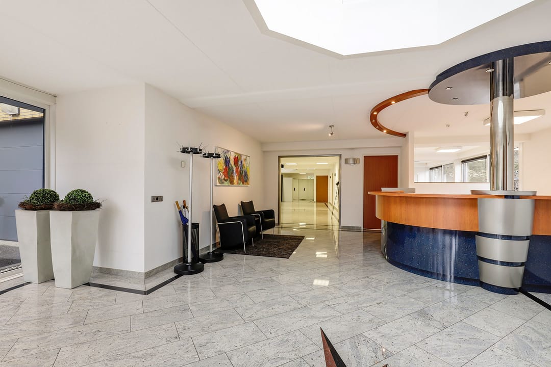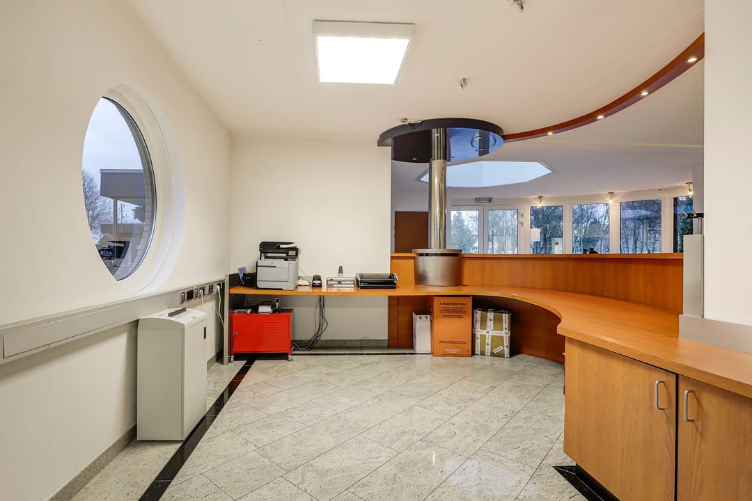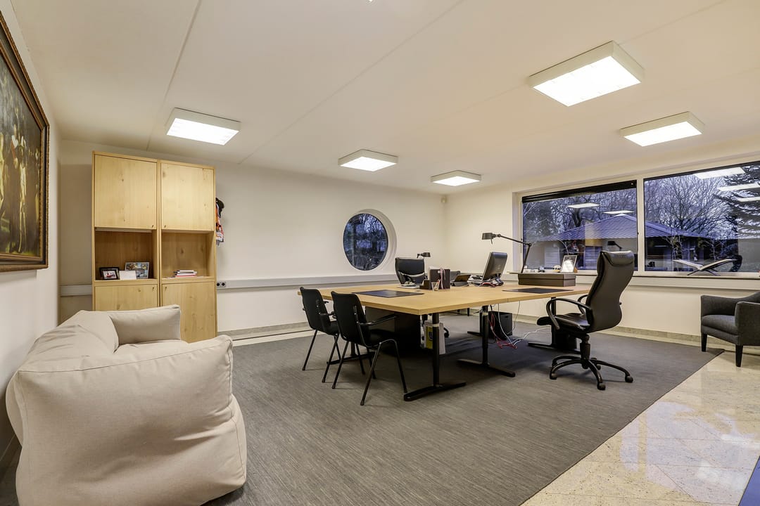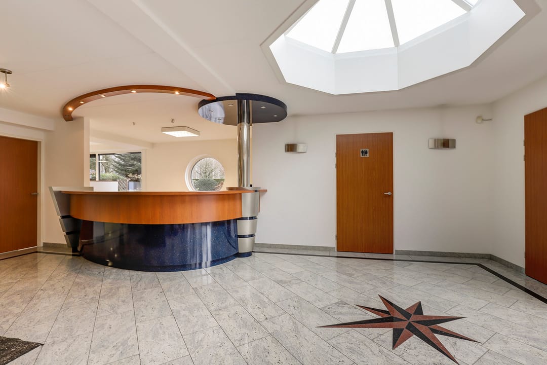 Het achtergelegen bedrijfsgedeelte (met eigen entree) is niet zomaar een bijgebouw. Hier vind je een ontvangsthal met receptie, een grote showroom- of werkruimte met open vide en meerdere afsluitbare kantoren of praktijkruimtes. Op de verdieping is nog een extra open kantoorruimte aanwezig. De afwerking is hoogwaardig, met marmeren vloeren, vloerverwarming, RVS details en uitstekende isolatie. Alles straalt kwaliteit en representativiteit uit.