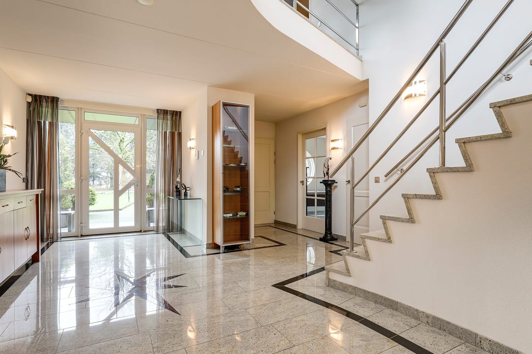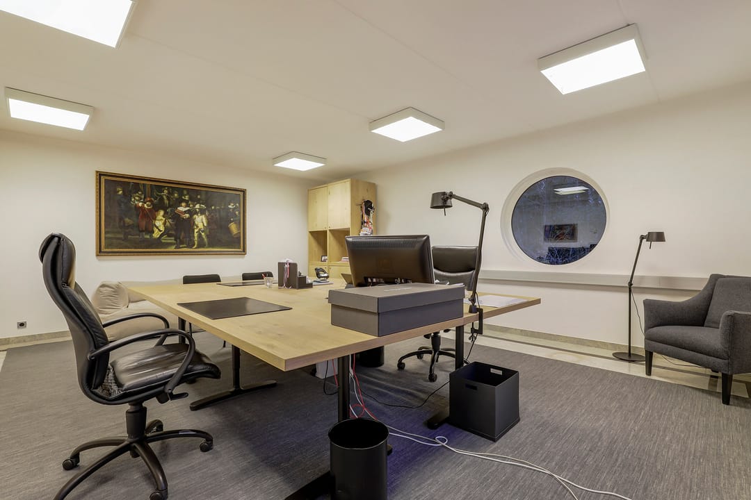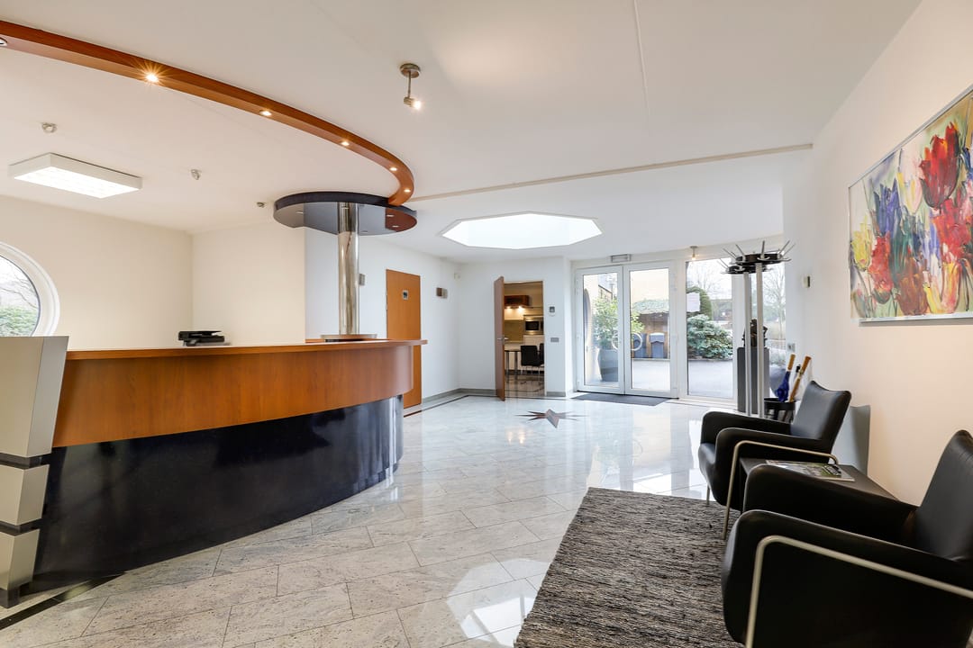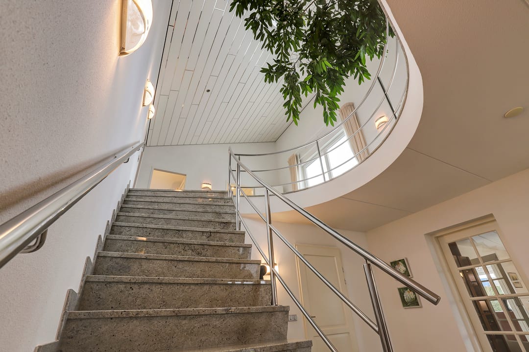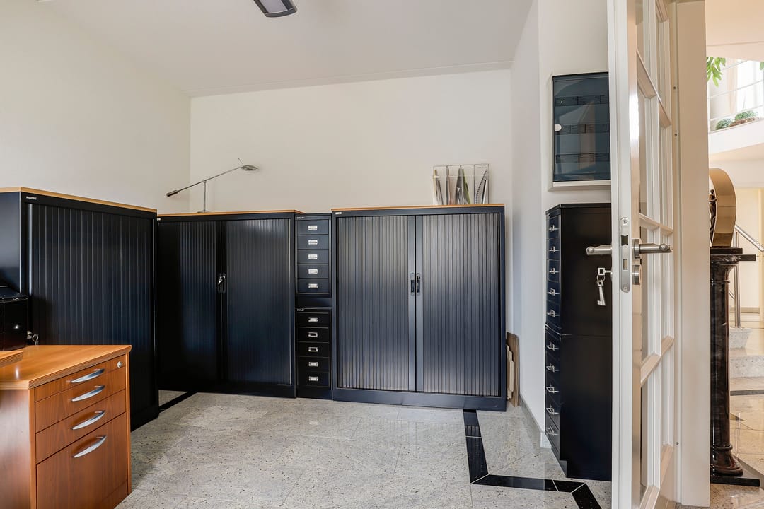 Het achtergelegen bedrijfsgedeelte (met eigen entree) is niet zomaar een bijgebouw. Hier vind je een ontvangsthal met receptie, een grote showroom- of werkruimte met open vide en meerdere afsluitbare kantoren of praktijkruimtes. Op de verdieping is nog een extra open kantoorruimte aanwezig. De afwerking is hoogwaardig, met marmeren vloeren, vloerverwarming, RVS details en uitstekende isolatie. Alles straalt kwaliteit en representativiteit uit.