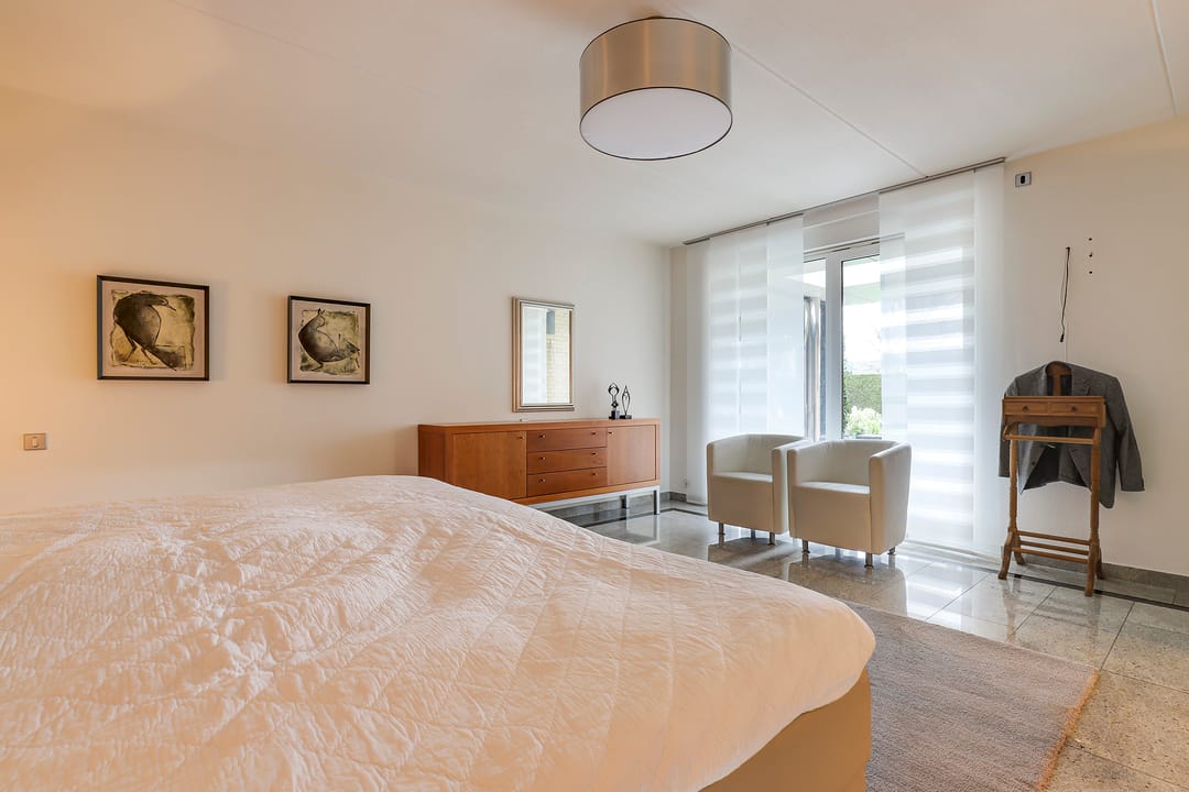 De begane grond beschikt over een comfortabele hoofdslaapkamer met een ruime inloopkast en directe toegang tot een eigen luxe badkamer met ligbad, aparte douche, toilet en wastafelmeubel. Ideaal als je nu al gelijkvloers wilt wonen of voorbereid wilt zijn op de toekomst. De living-woonkamer is prachtig met veel lichtinval en zicht rondom op de tuinen, een houtkachel maakt dit tot een gezellige ruimte. Aansluitend de royale eetkamer met keuken en schuifpui naar de terassen.