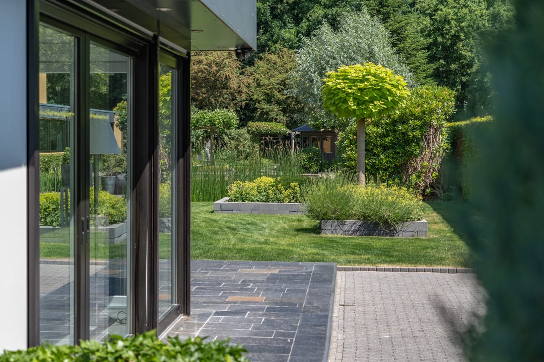 SCHITTEREND AANGELEGDE TUIN MET VIJVER EN VERANDA