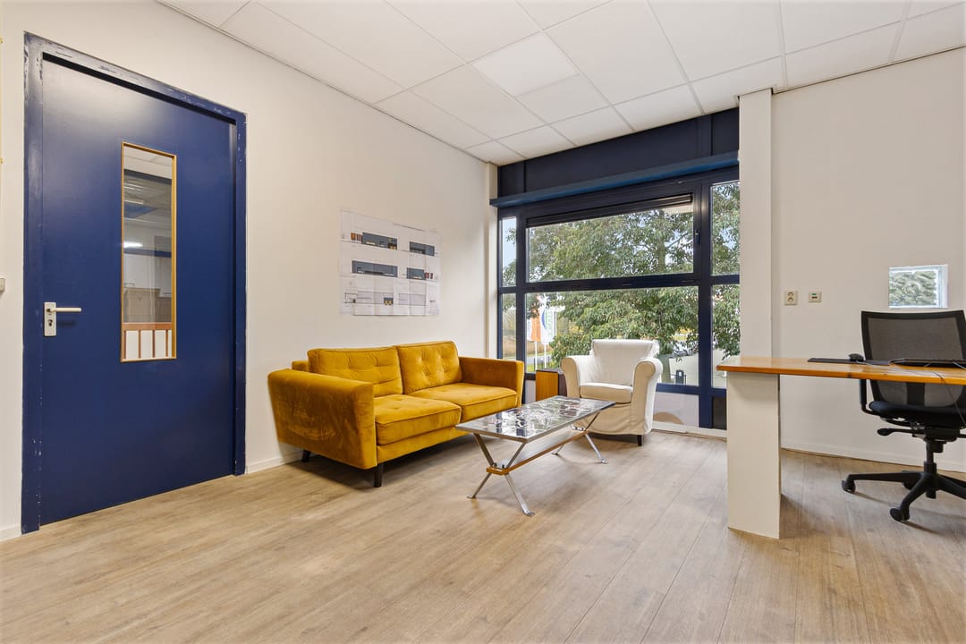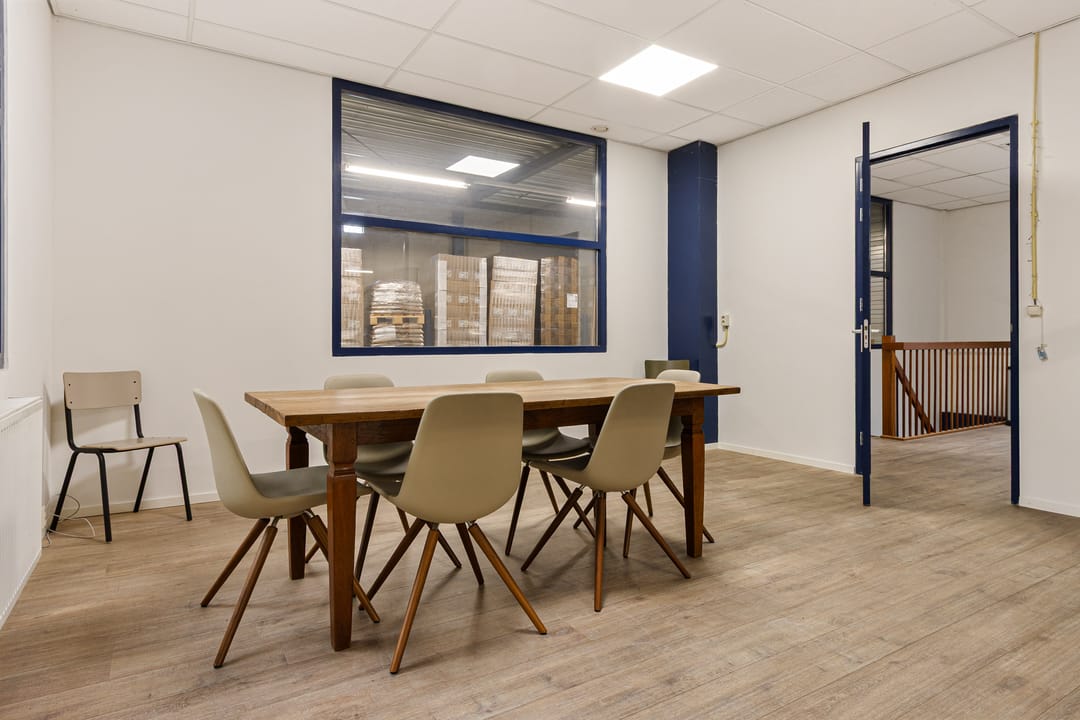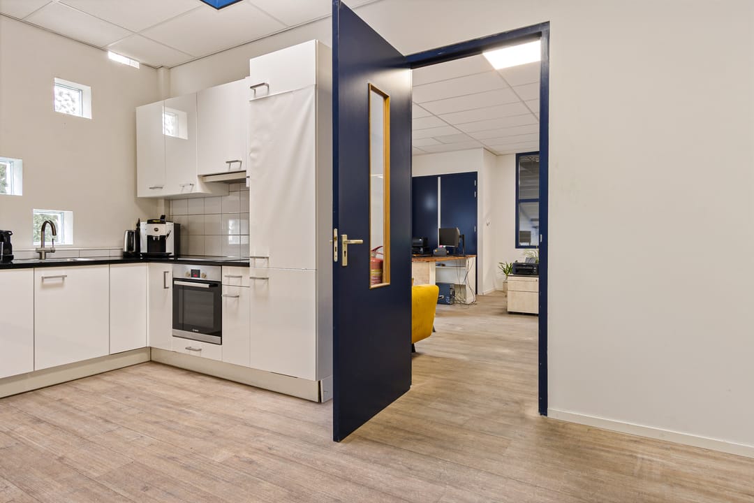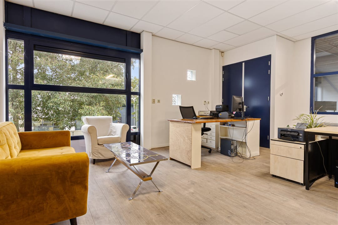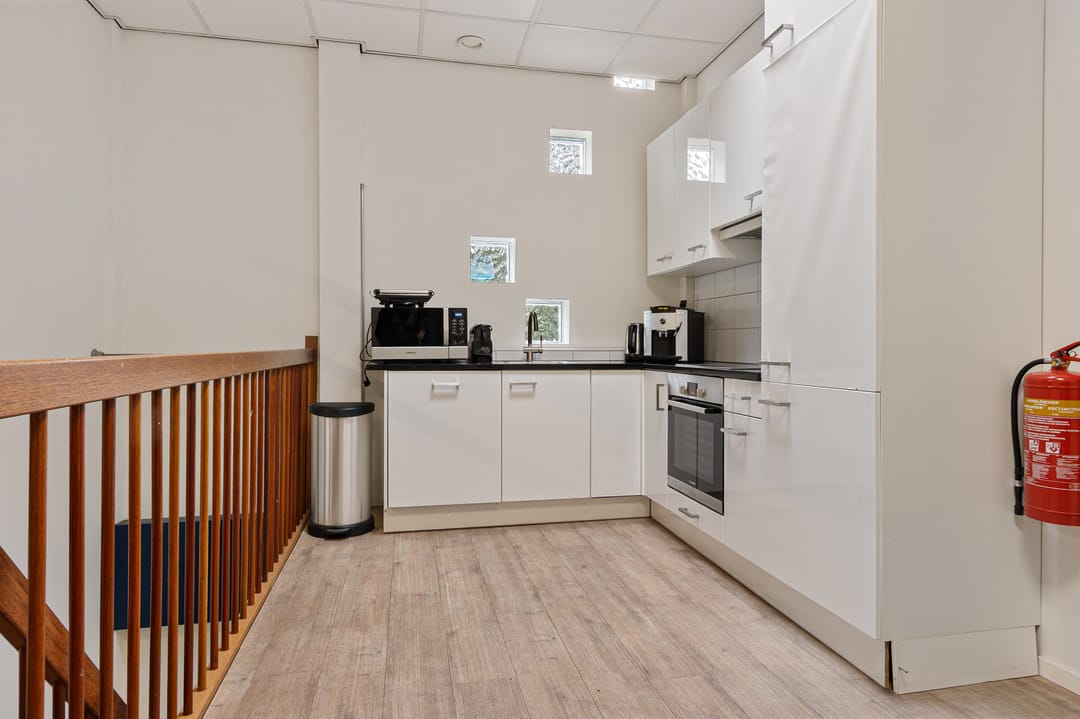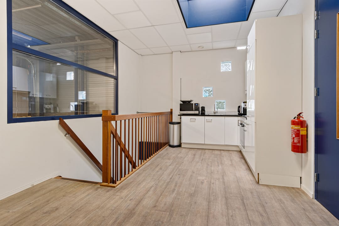 De kantoorruimte bevindt zich op de verdieping en bestaat uit een ruime overloop met pantry en twee lichte kantoren, te gebruiken als werkruimte of kantine. De pantry en keuken zijn in 2022 gemoderniseerd.
