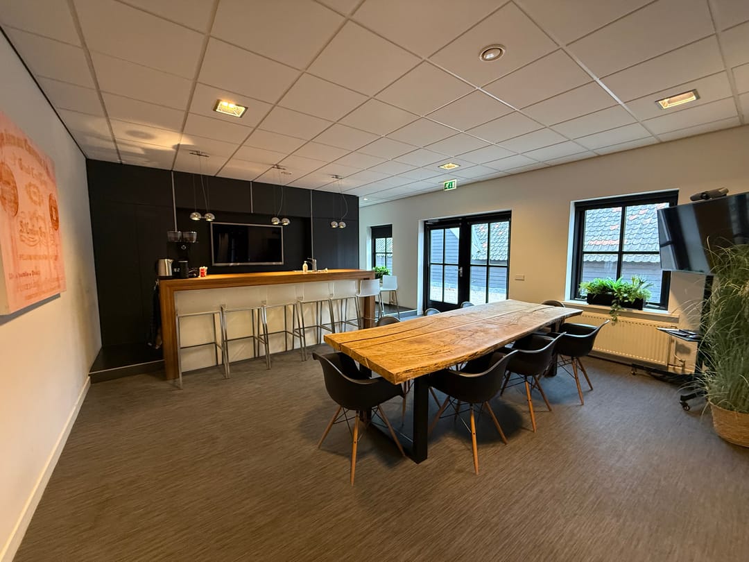 Entree met toegang naar kantine met bar, spreekkamer, kantoorruimte, open bedrijfsruimte met trapopgang naar verdieping.