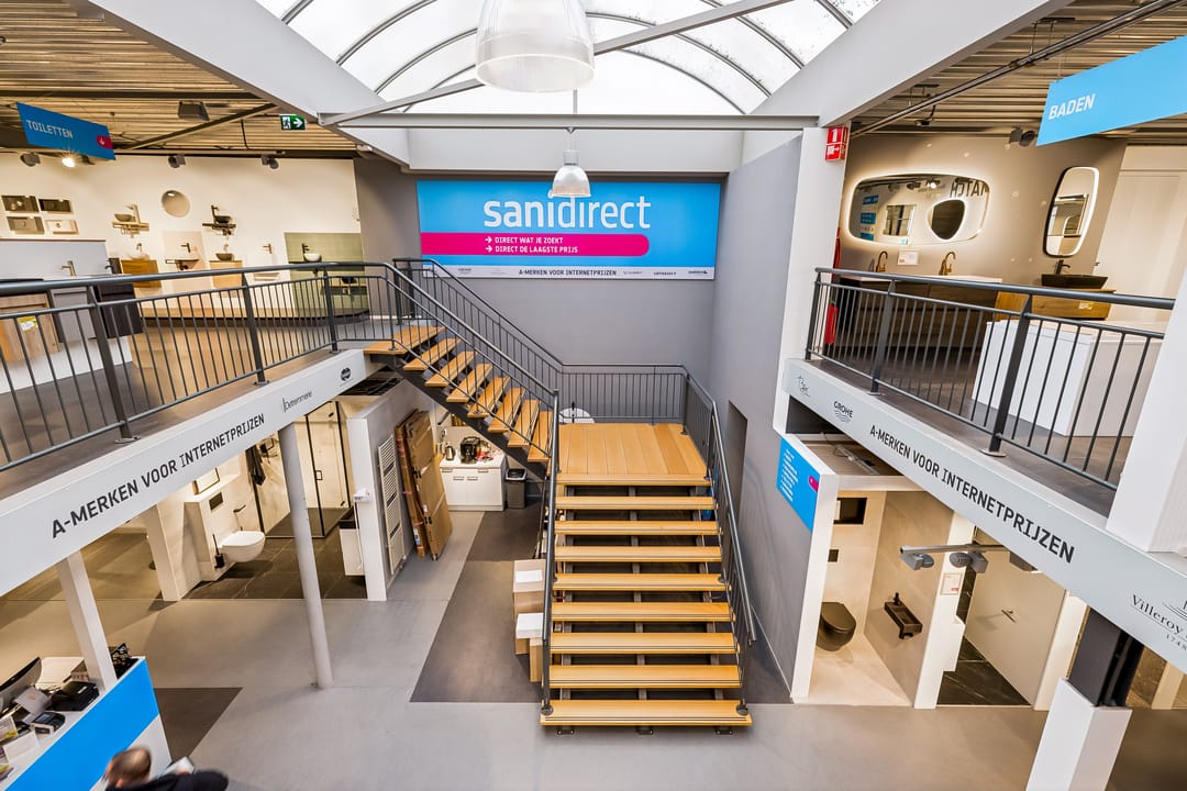 Entree, showroom met pantry en toiletten en trapopgang naar eerste verdieping, bedrijfsruimtes.