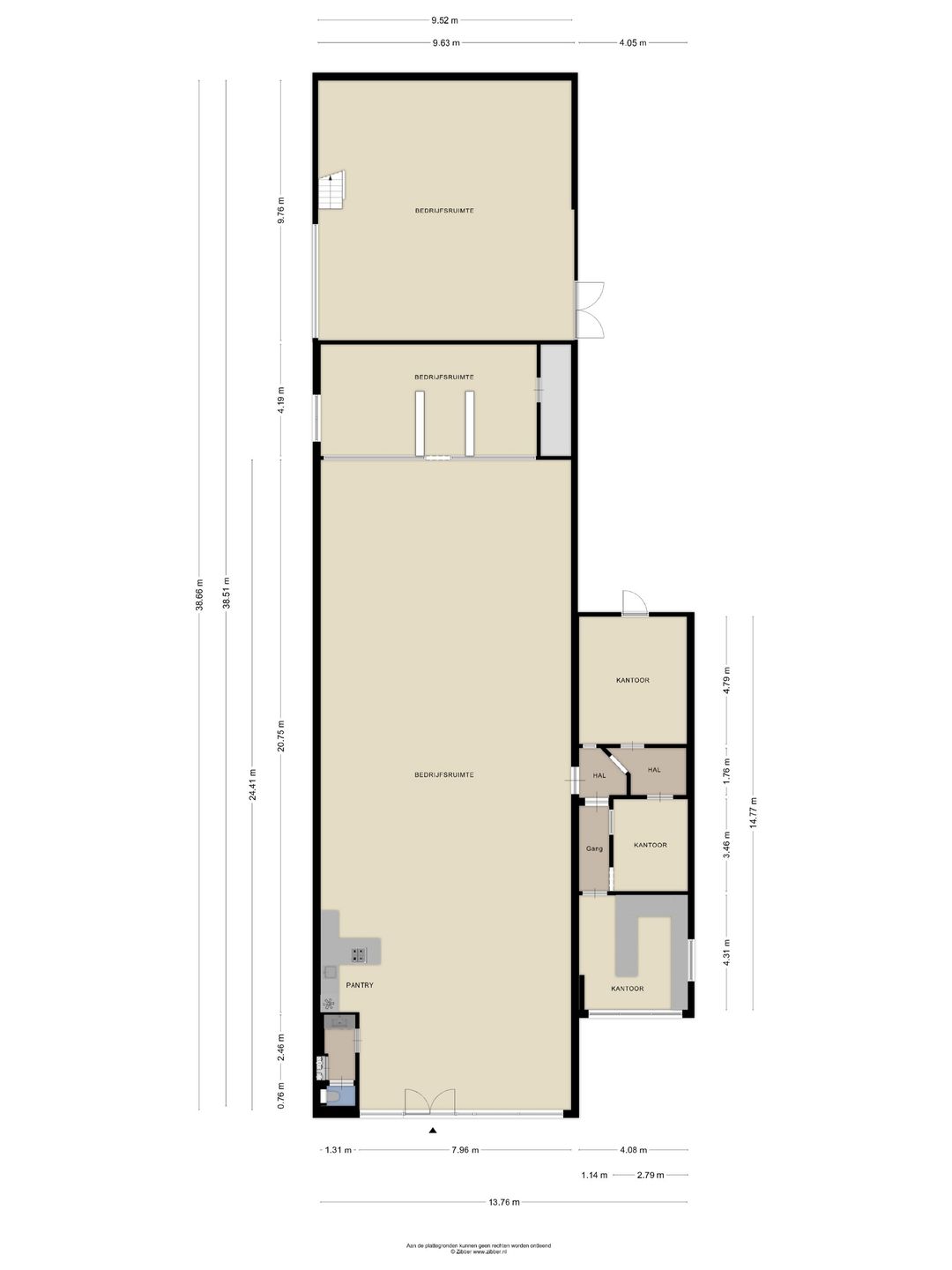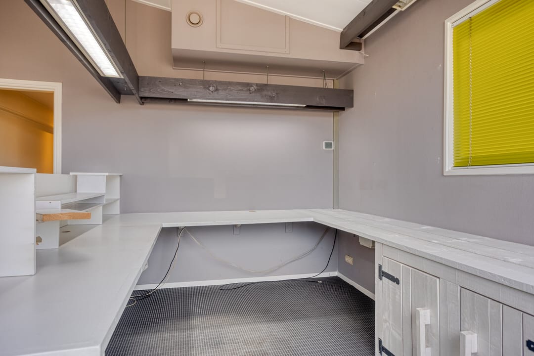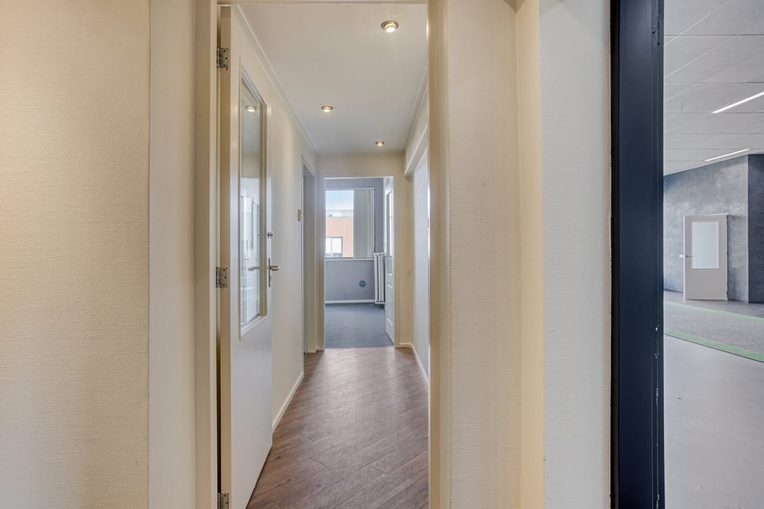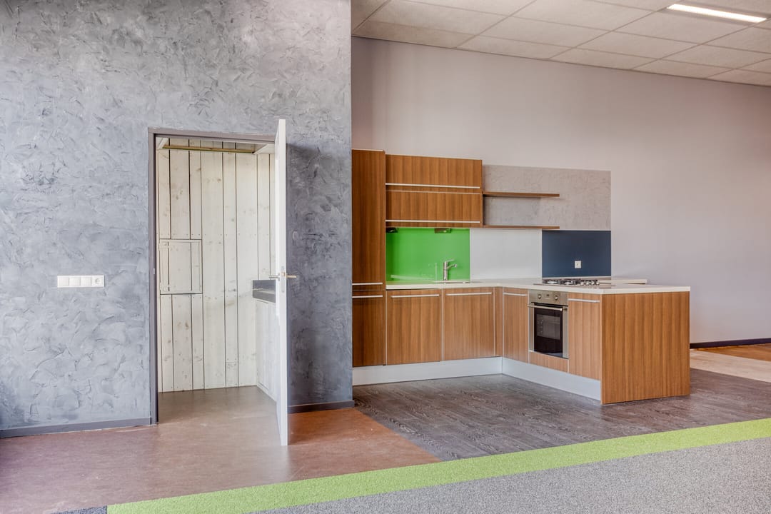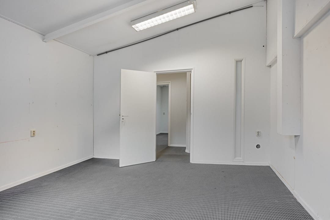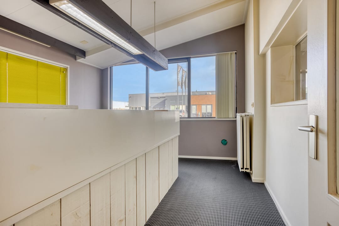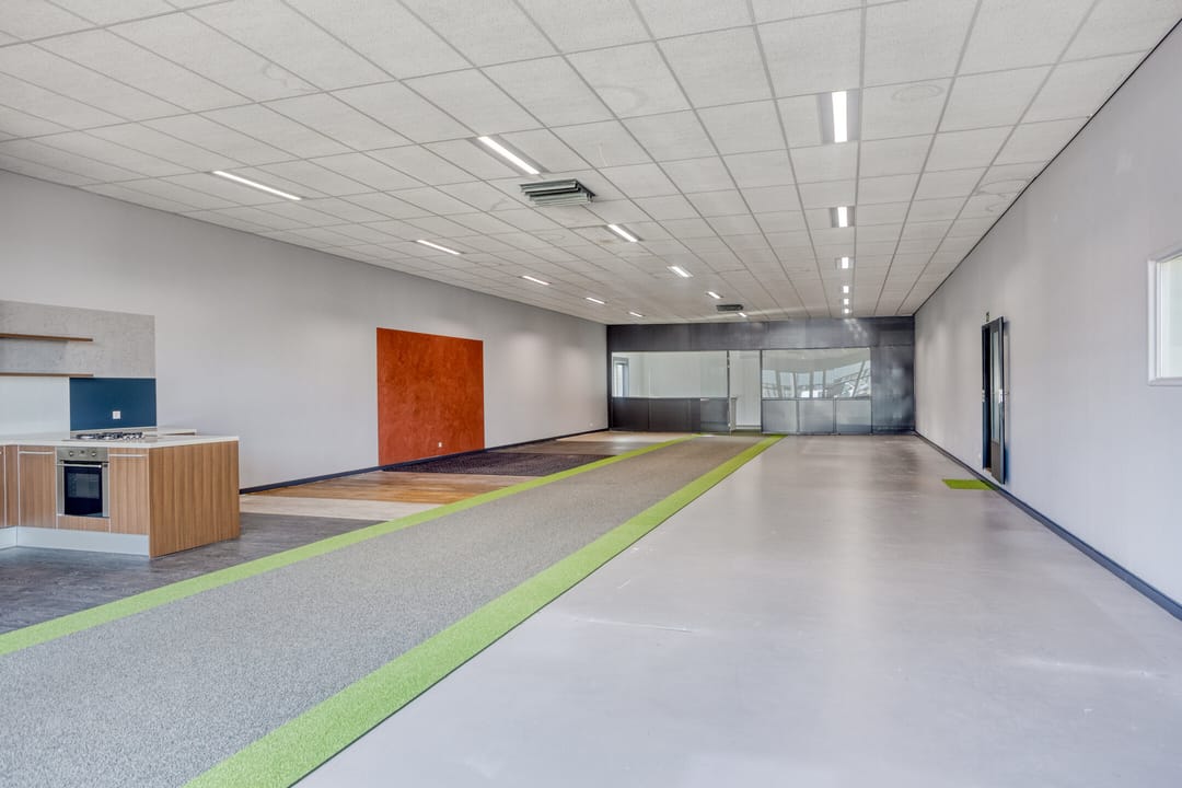 Entree in de royale, open ruimte waar volop mogelijkheden liggen om deze te benutten zoals gewenst. Er is voldoende kantoorruimte gecreëerd; in de open ruimte kunt u een mooie, afsluitbare werkplek inrichten met zicht op de hal (voorzien van airconditioning), daarnaast zijn er nog 3 kantoorruimtes in de aanbouw gesitueerd. De grote bedrijfshal heeft een moderne L-vormige keuken welke is voorzien van de volgende inbouwapparatuur: 4-pitsgasfornuis, combimagnetron en koelkast. Vanuit de ruimte heeft u toegang tot een kleine hal met het toilet, een aparte wastafel en kleine vliering waar de C.V.-opstelling is geplaatst.