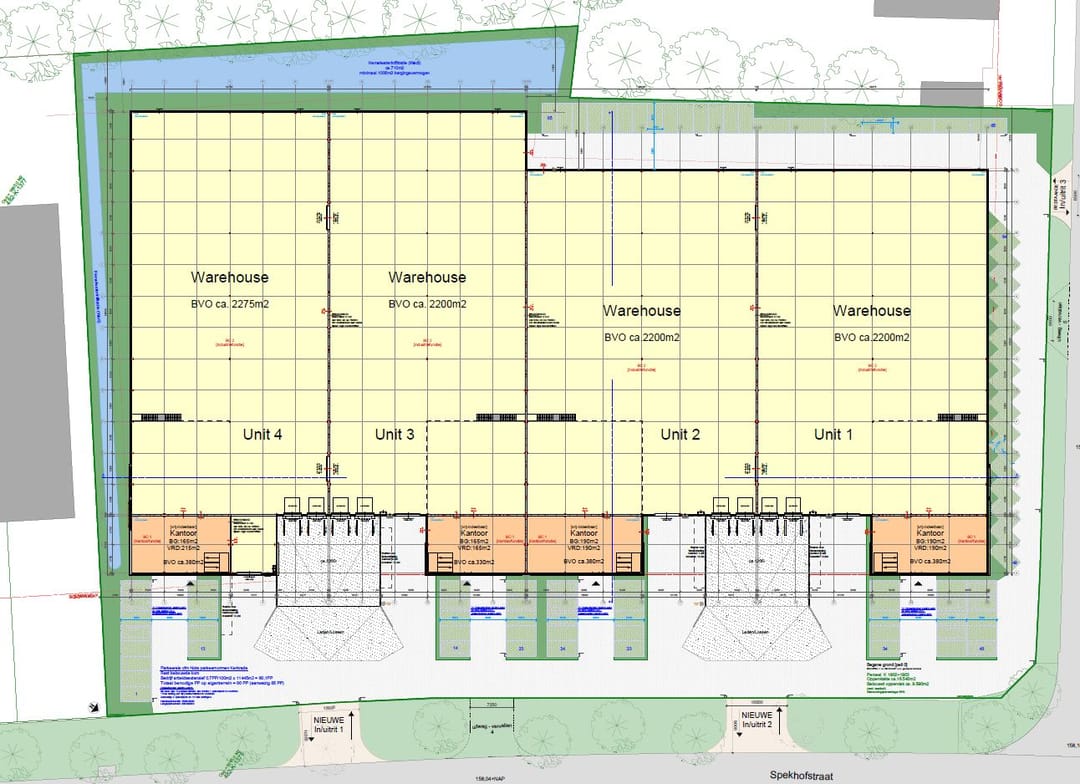 Op bedrijventerrein Spekholzerheide in Kerkrade worden vier aaneengesloten, nog te realiseren bedrijfsunits te koop en of te huur aangeboden. De nieuwbouw omvat opslag- en bedrijfsruimte, alsmede kantoor- en parkeerfaciliteit en voorziet in een gezamenlijk metrage ter grootte van ca. 11.450 m² BVO. Iedere unit is afzonderlijk beschikbaar (vanaf circa 2.800 m²), maar het huren / kopen van geschakelde eenheden behoort ook tot de mogelijkheden.